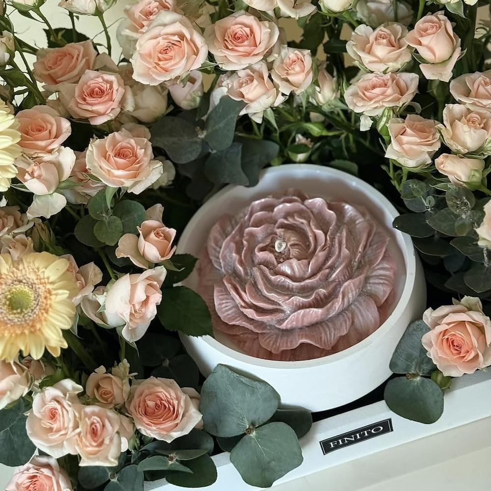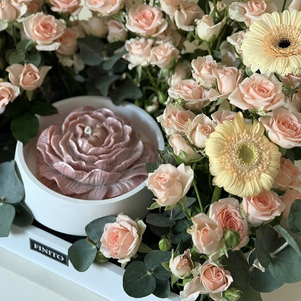 A bouquet containing baby roses and gerberas, arranged beautifully in a tray with a candle.