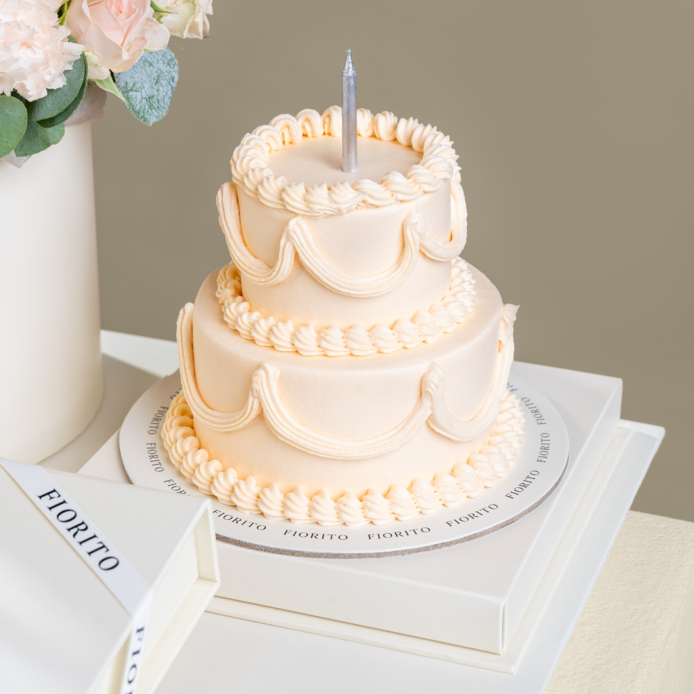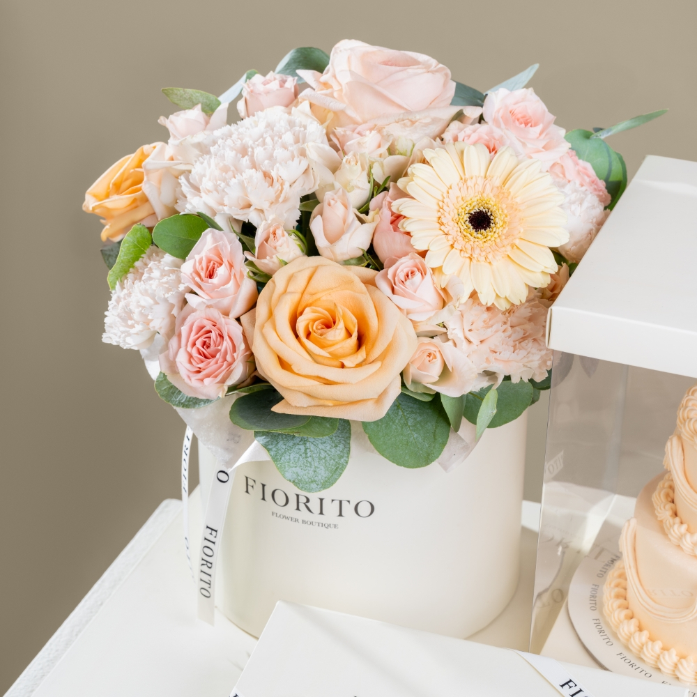 A tray showcasing a flower box filled with roses, gerbera, baby roses and carnations accompanied by a box of premium French chocolate and a delicious cake. A refined choice to make any occasion memorable.
