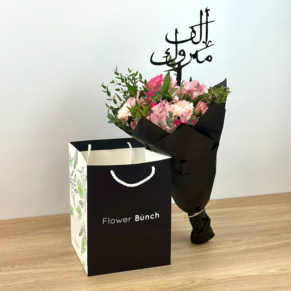 A hand bouquet containing roses, cherries, and carnations with greenery.