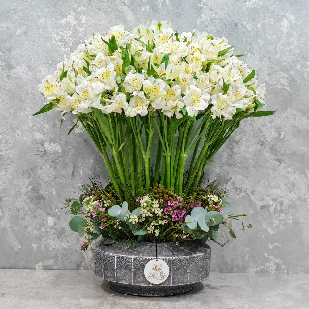 A bouquet containing white alstroemeria flowers, arranged beautifully in a vase.