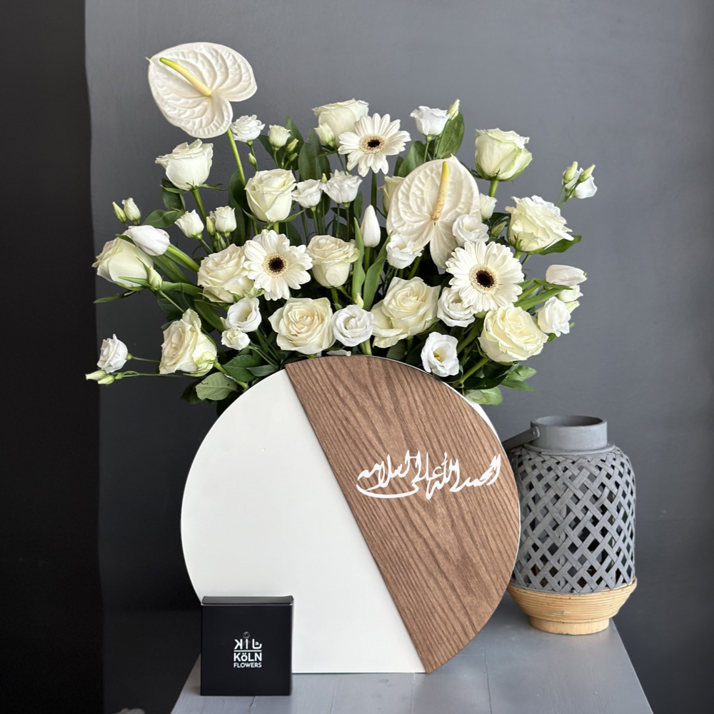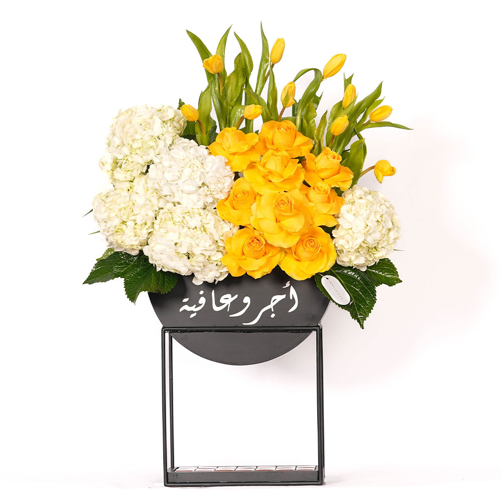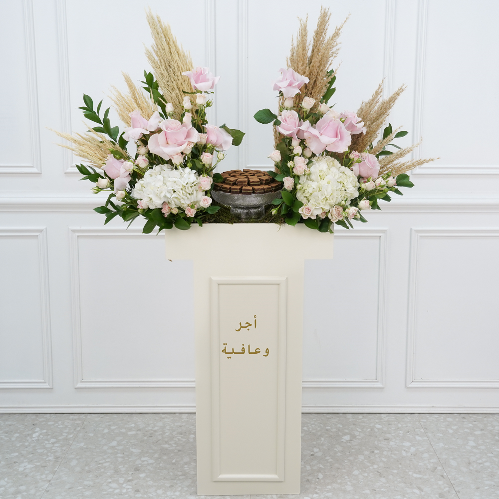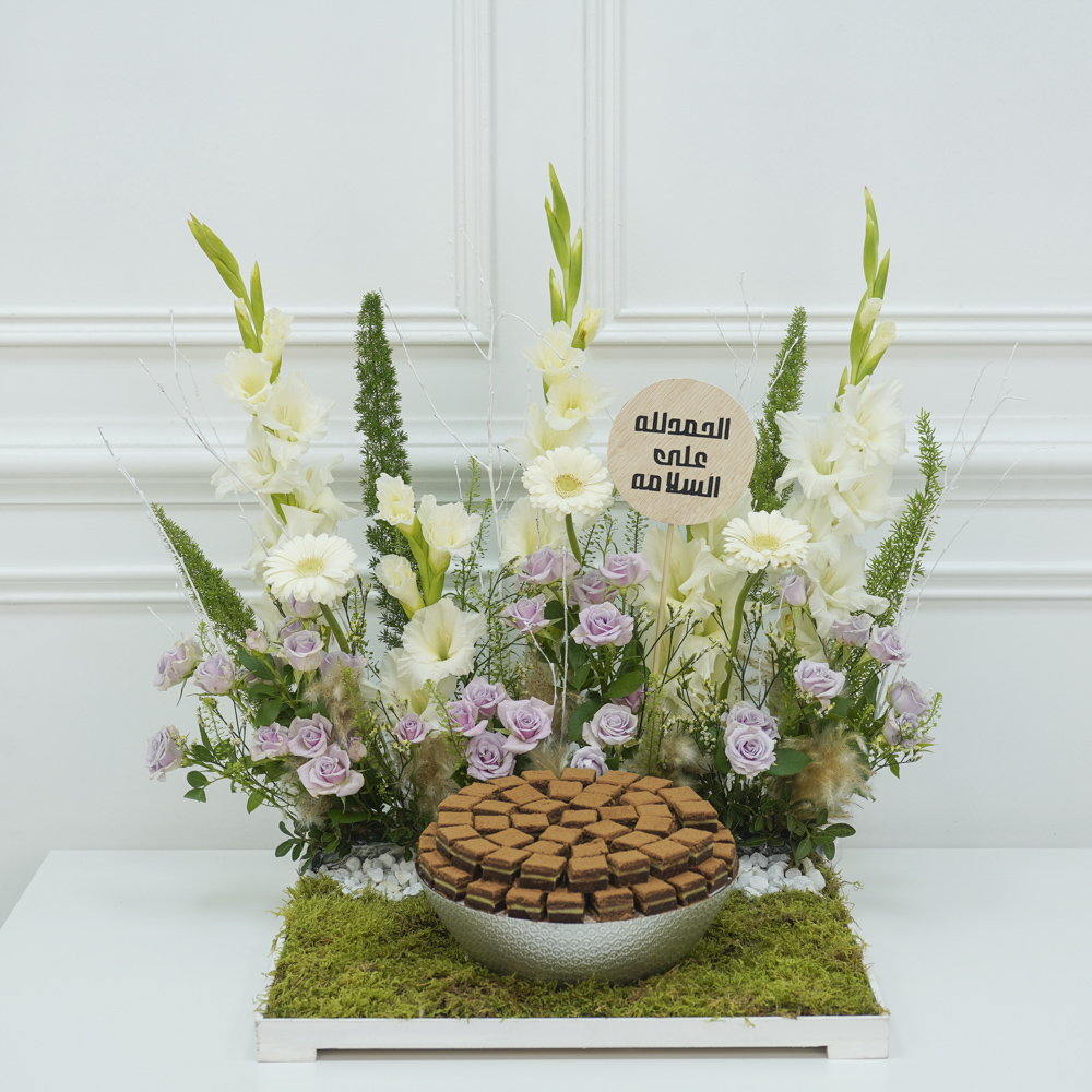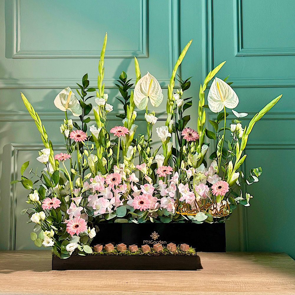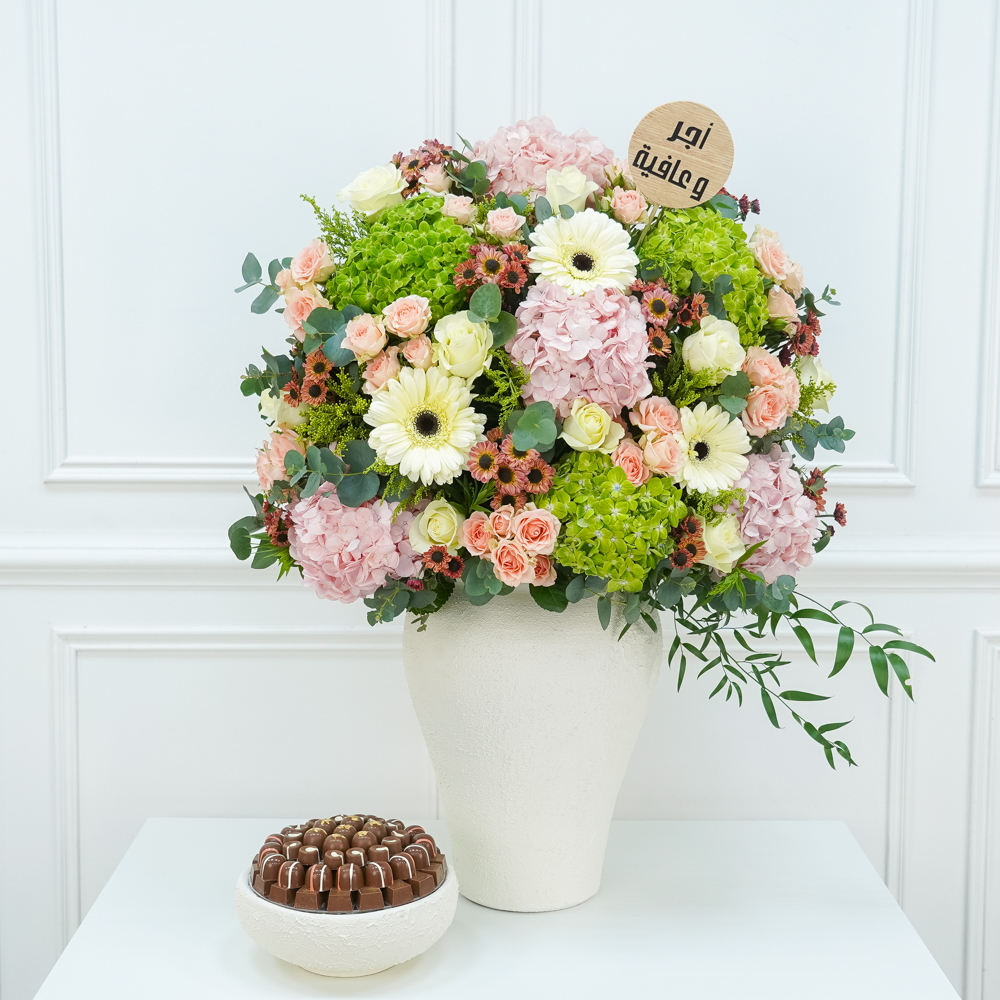 This bouquet contains gerbera, baby roses and hydrangea with chocolates.