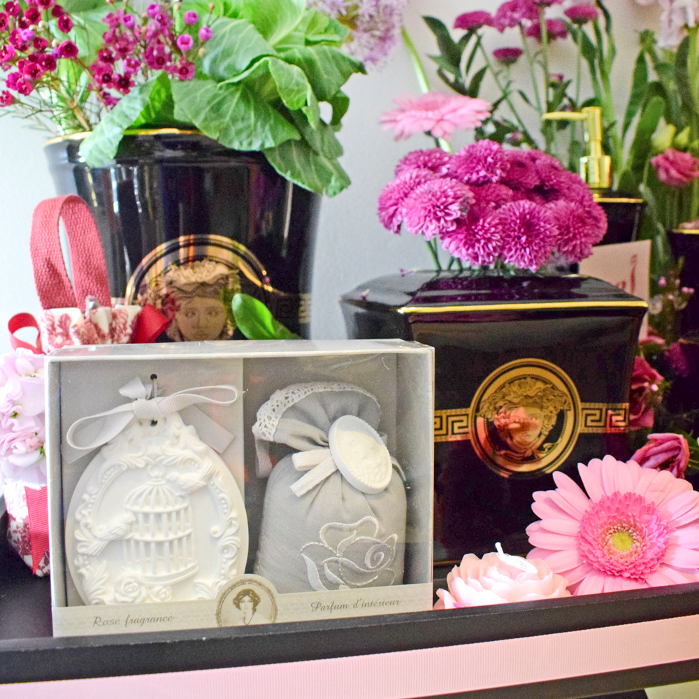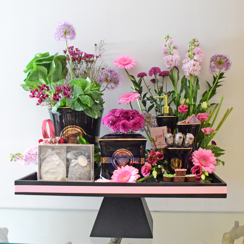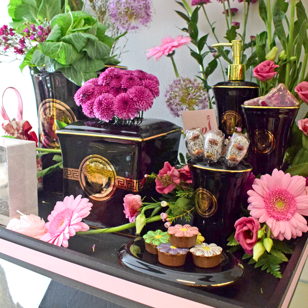 Versace inspired "mom" ceramic Bathroom set with scented candle, home perfume, chocolates and a decoration of fresh gerbera, matola, lisianthus, astromeria and crysanth flowers.