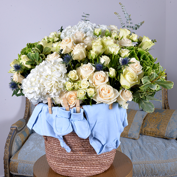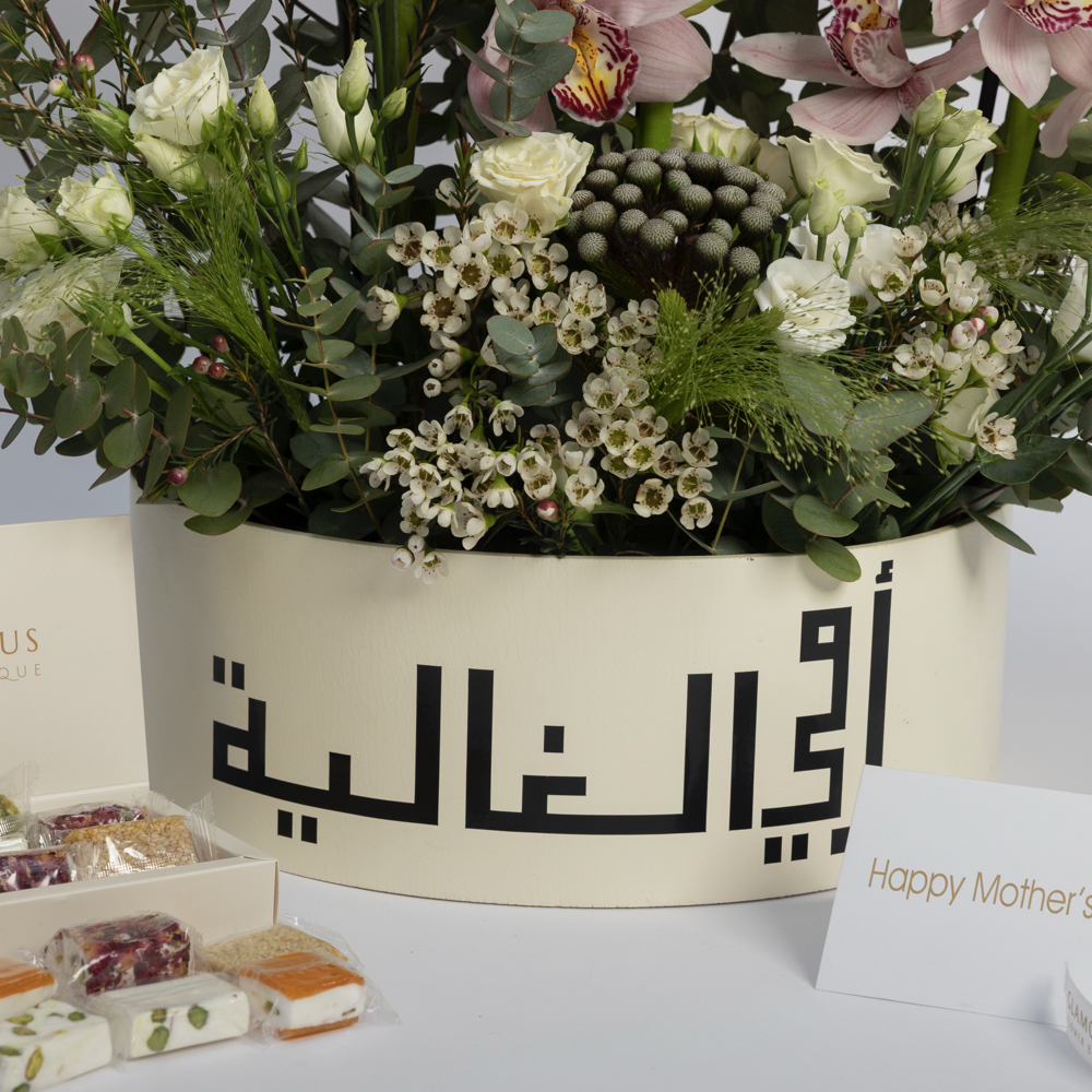 Cymbidium and eustoma flowers with brunia, wax flowers, and green safari arranged beautifully in a box with a box of sweets.