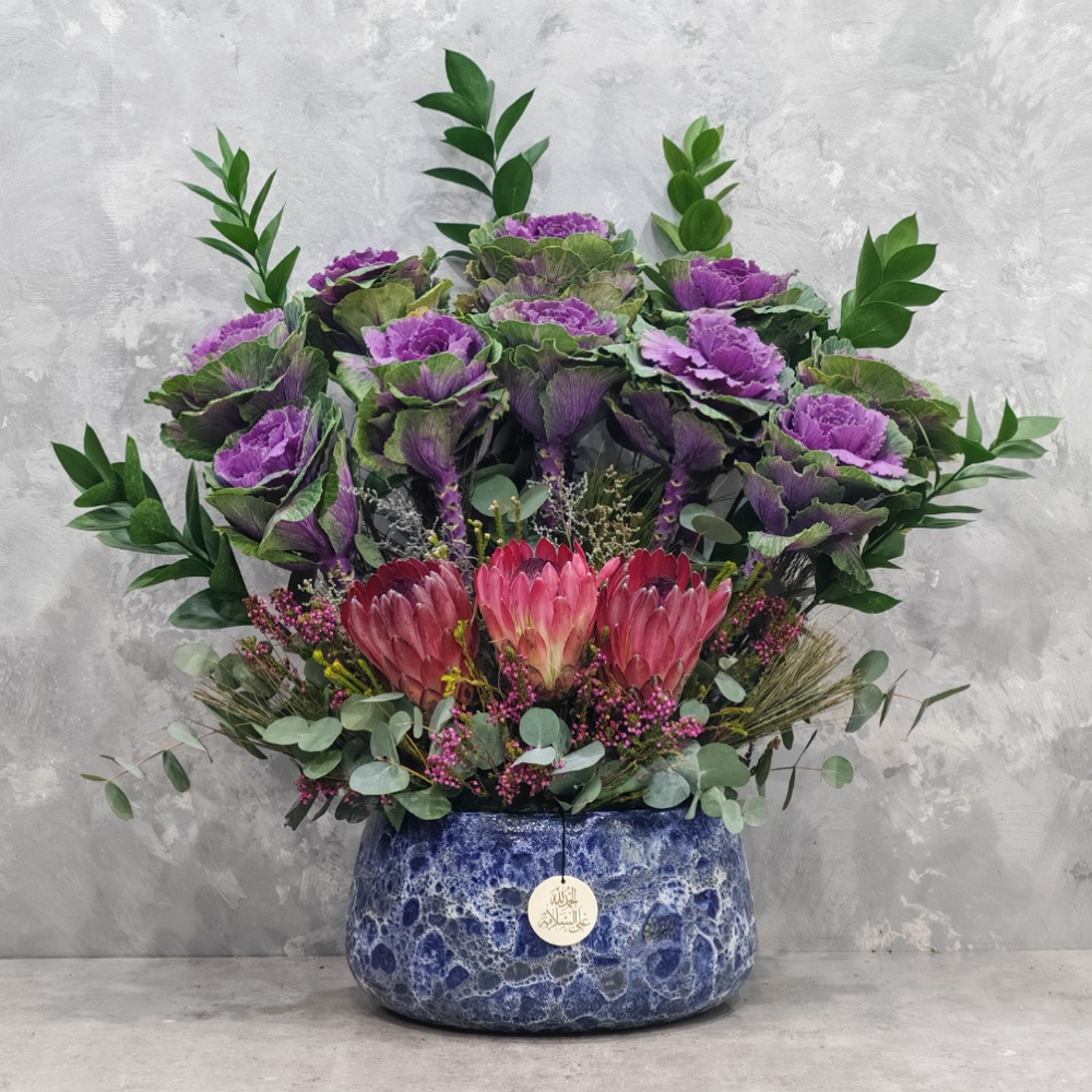This stand contains orchid plants and carnation flowers.