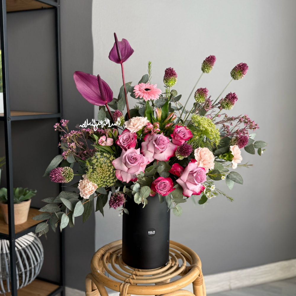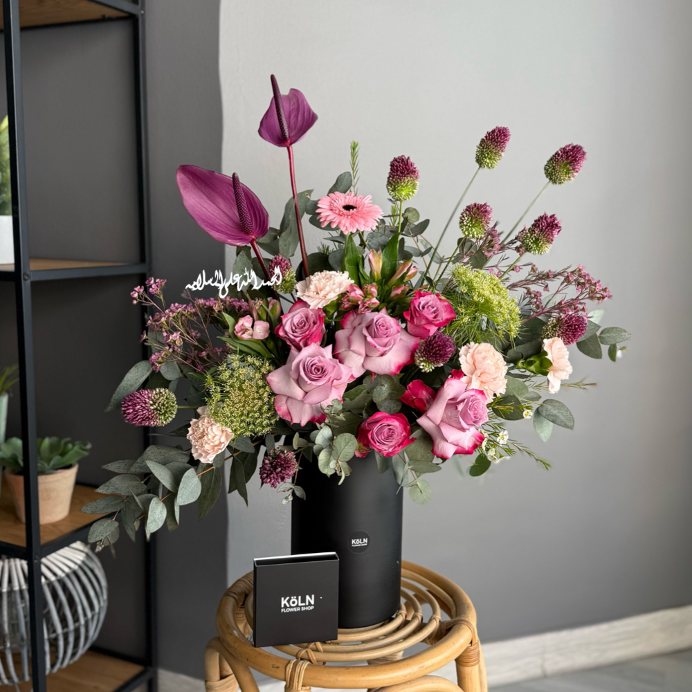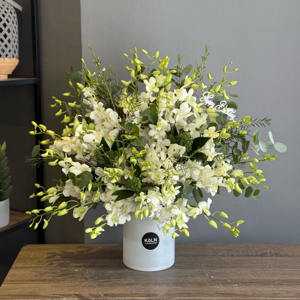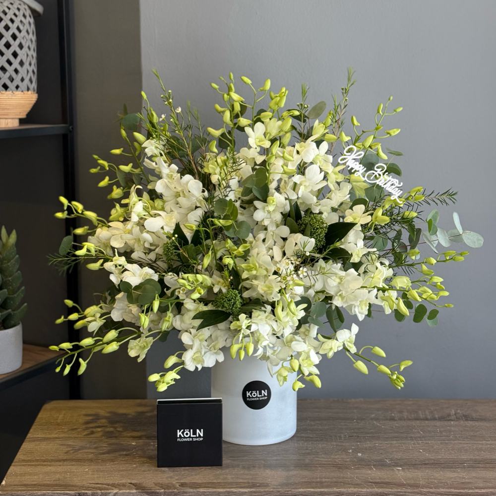 This bouquet contains orchid, eustoma and gerbera flowers.