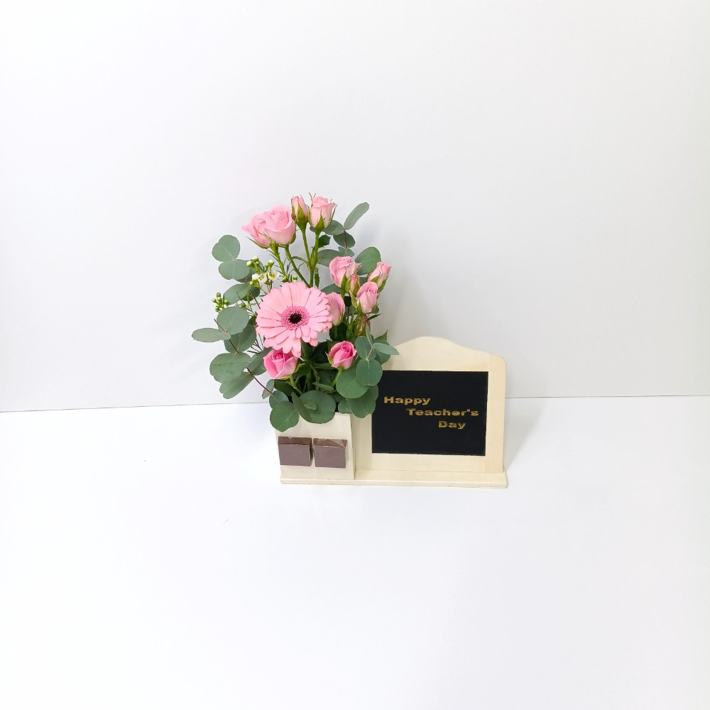 This bouquet contains baby roses and gerberas with 2 pieces of chocolate.