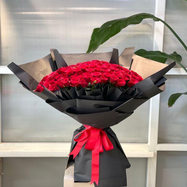 This arrangement contains a hand bouquet of 100 roses.
