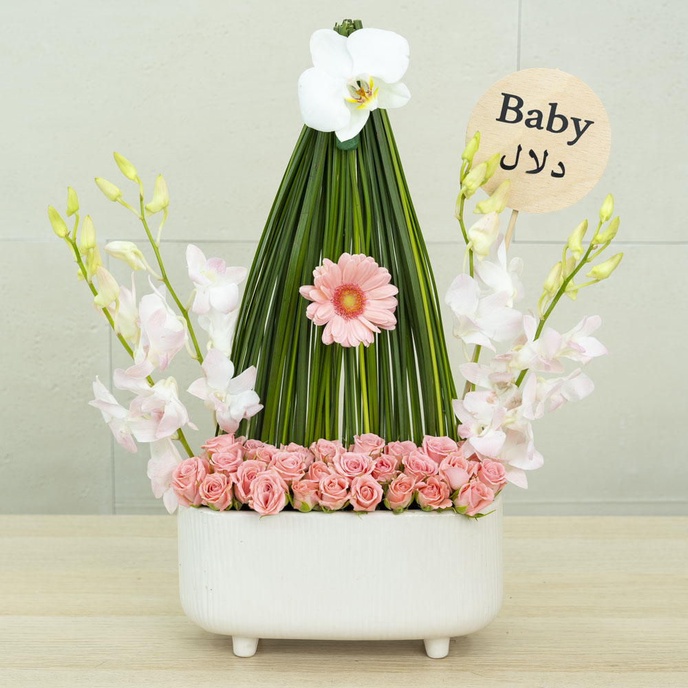 This bouquet contains roses, carnations, and hydrangeas arranged beautifully on a stand.