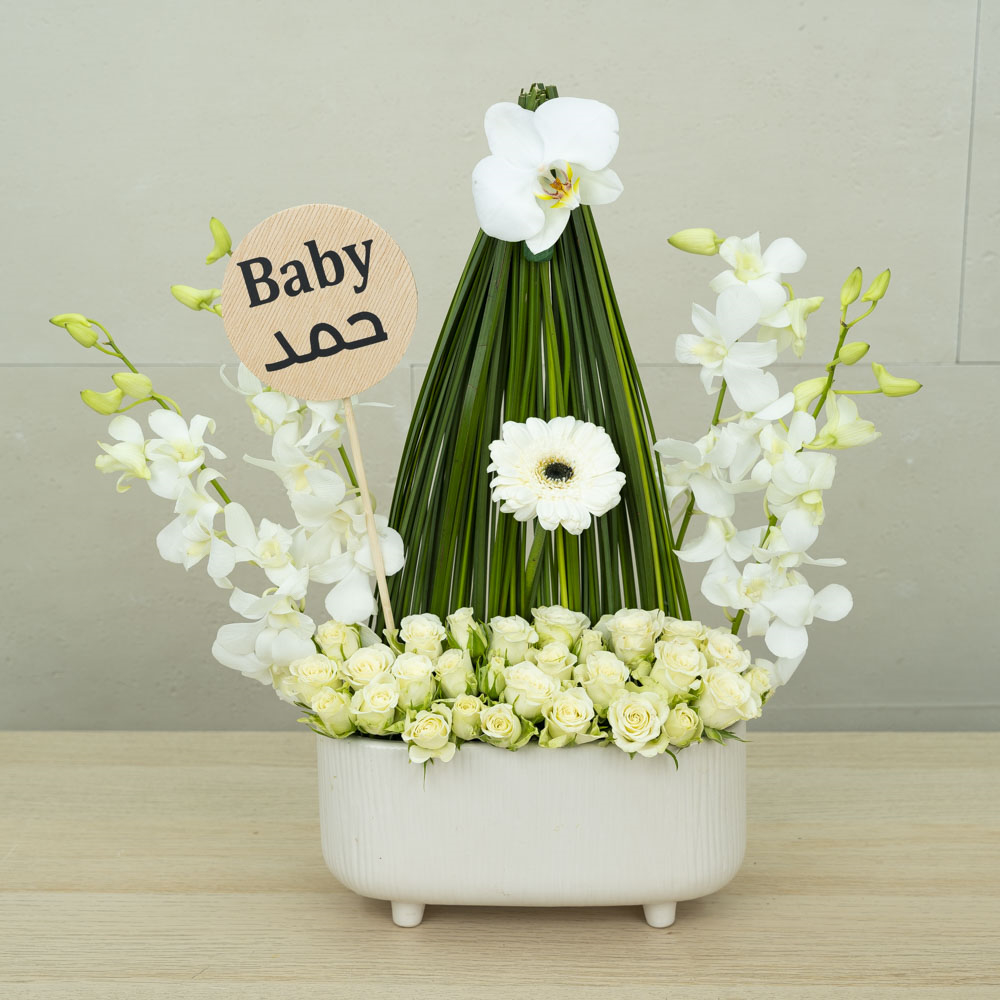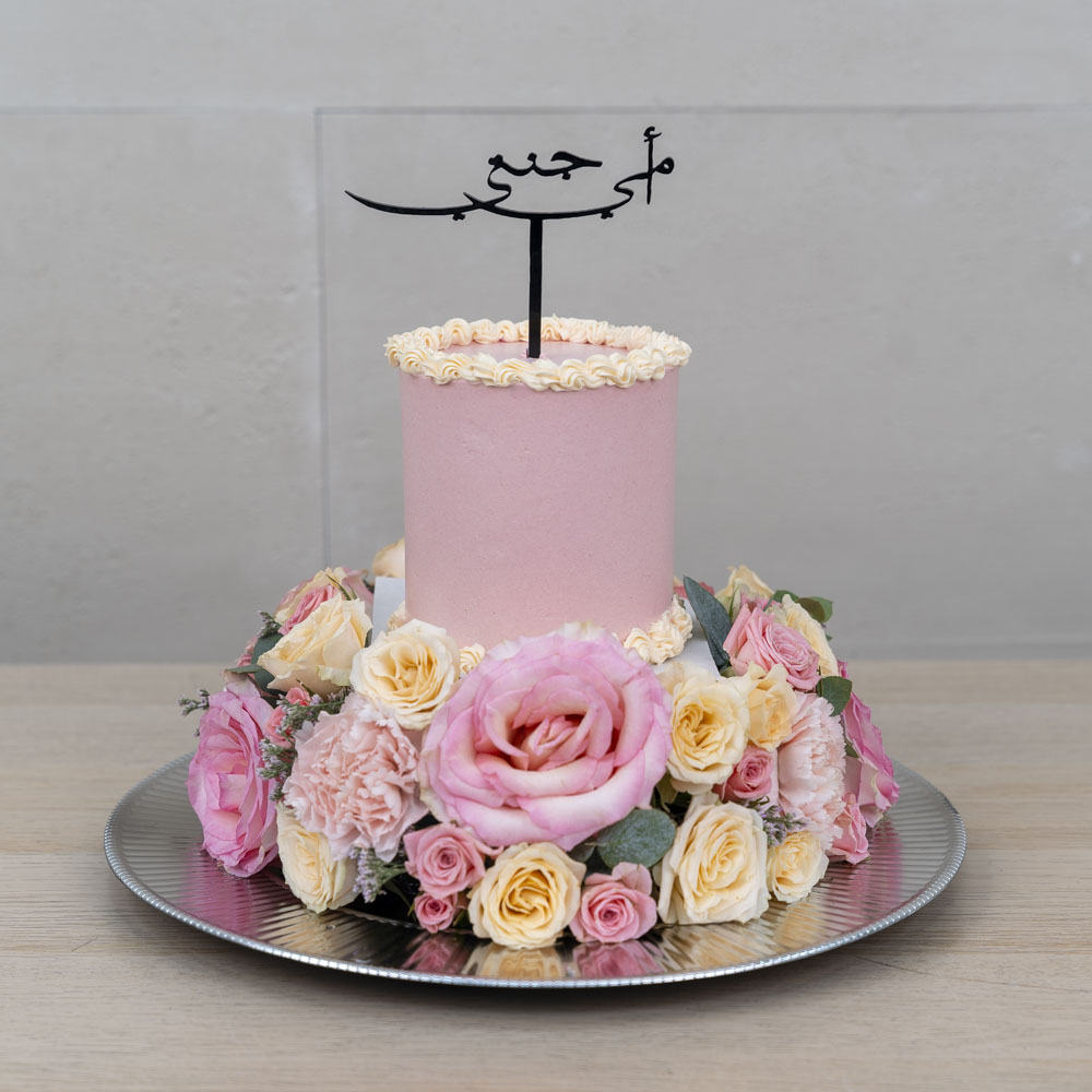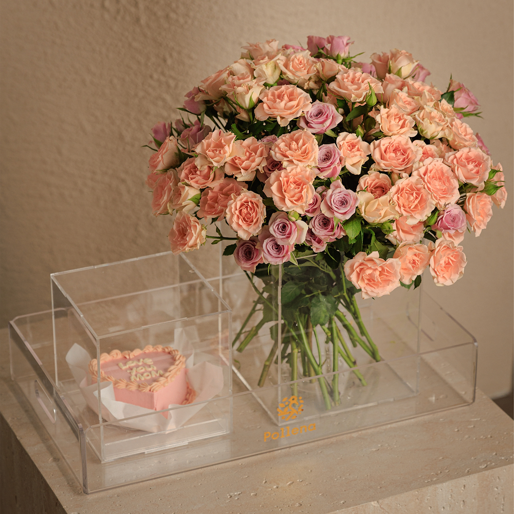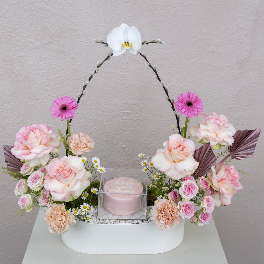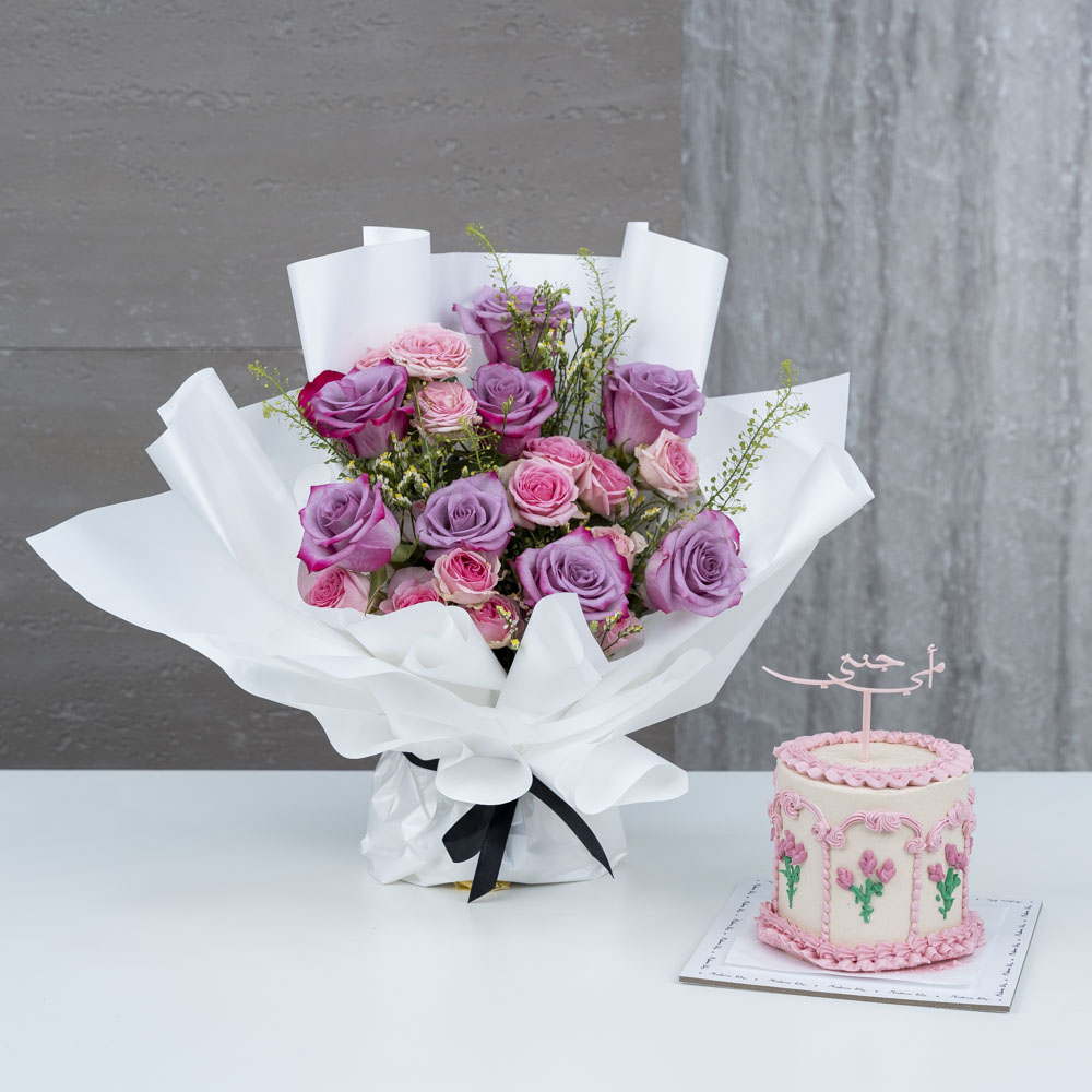 This bouquet contains roses and carnations with a chocolate cake. Note: the cake is wrapped separately in a box.