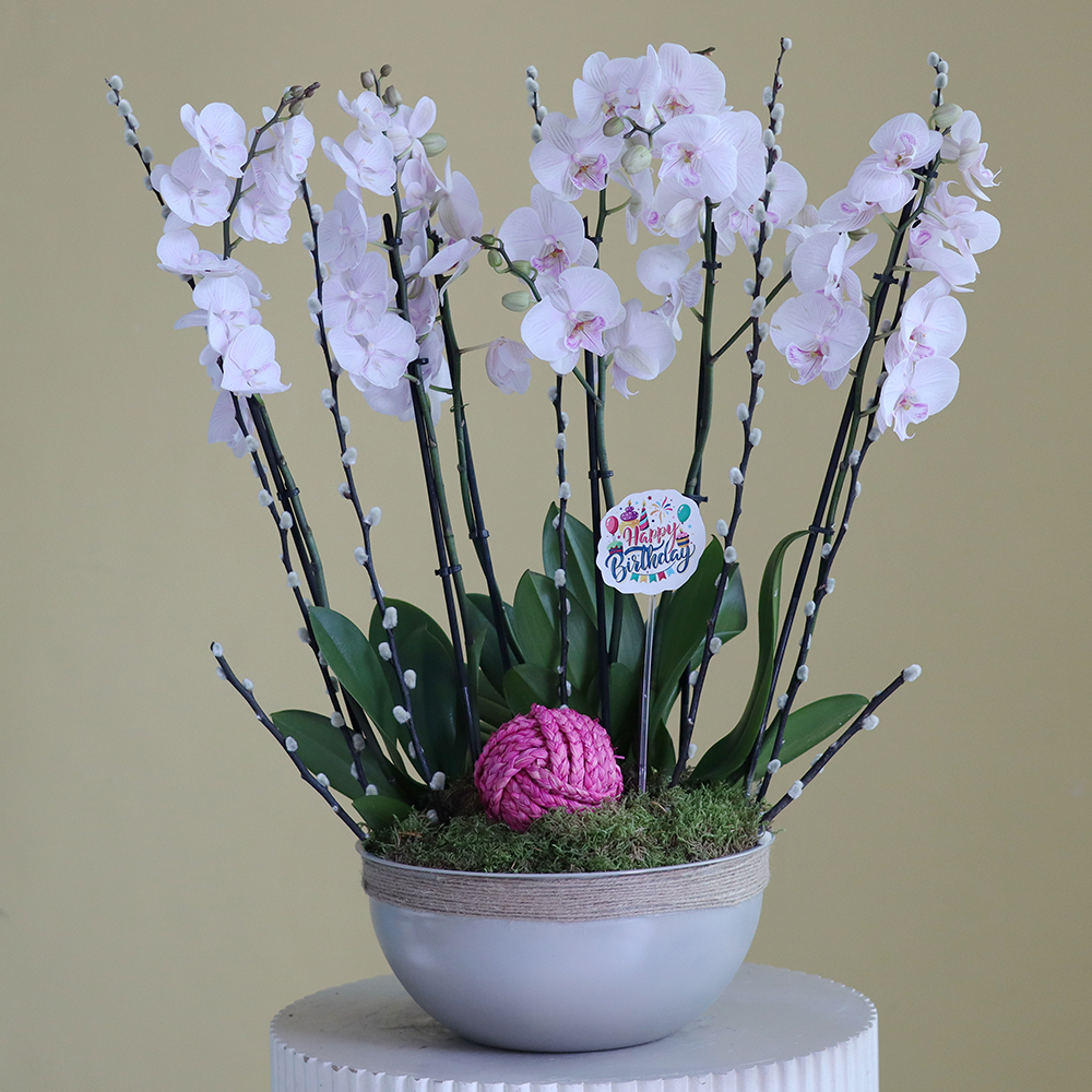Beautiful pink ranunculus, hydrangeas, and baby roses, arranged in a round vase.