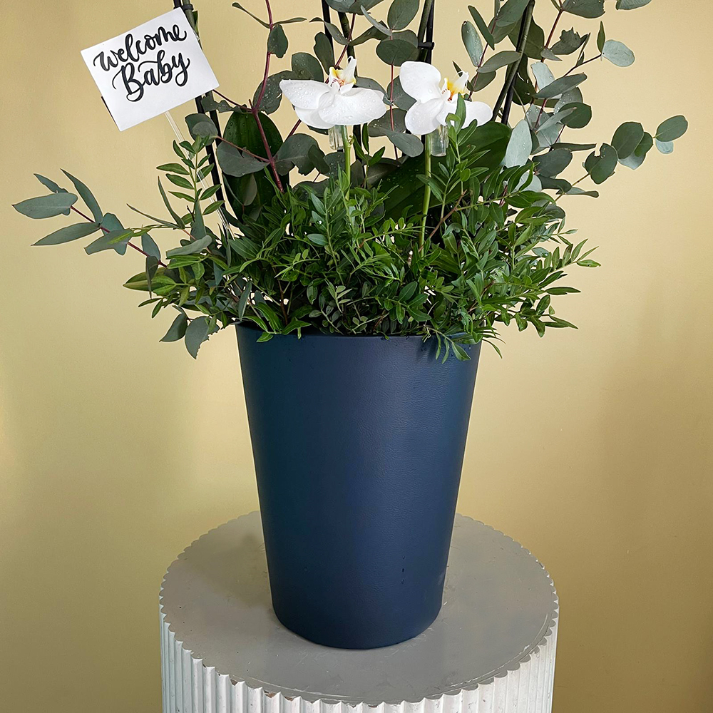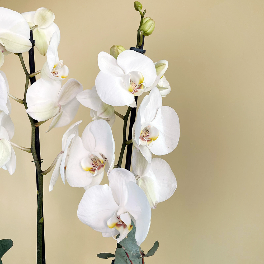 A bouquet containing white orchid plants, arranged beautifully in a luxurious vase.