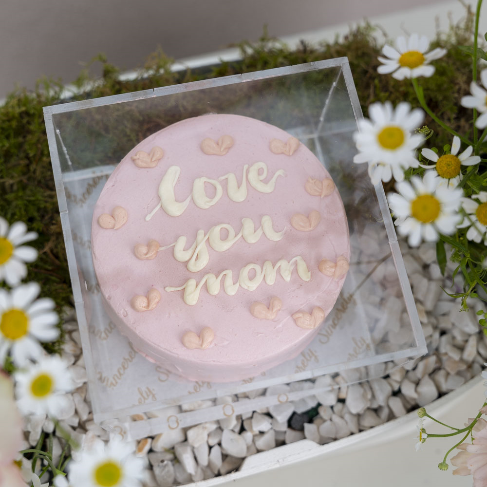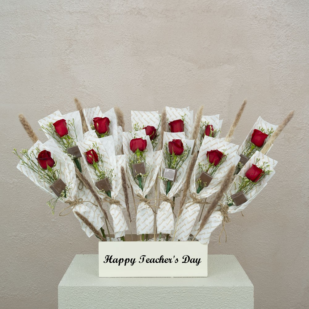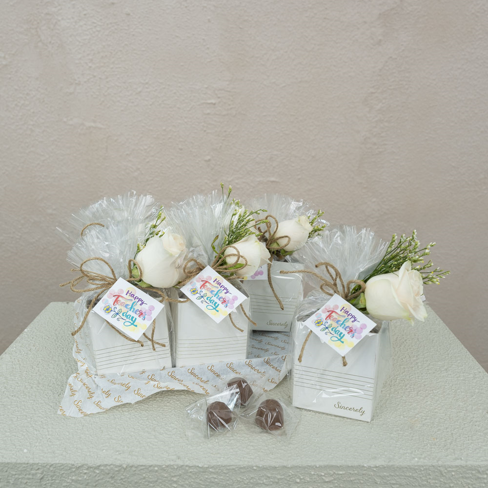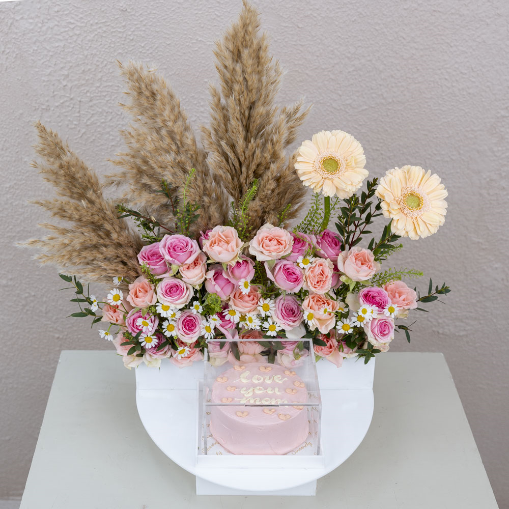 This bouquet contains roses and baby roses with a mini chocolate cake.