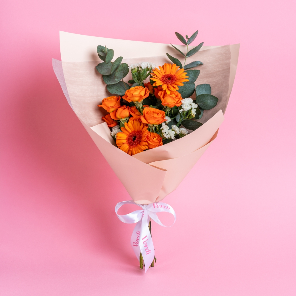 A cheerful hand bouquet of carnations, baby roses, and roses, blending timeless elegance with playful flair. A perfect gesture to express love, gratitude, and sweet surprises.