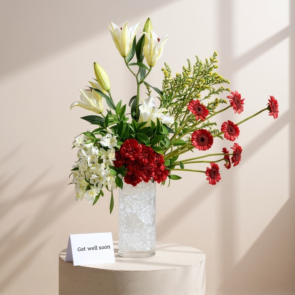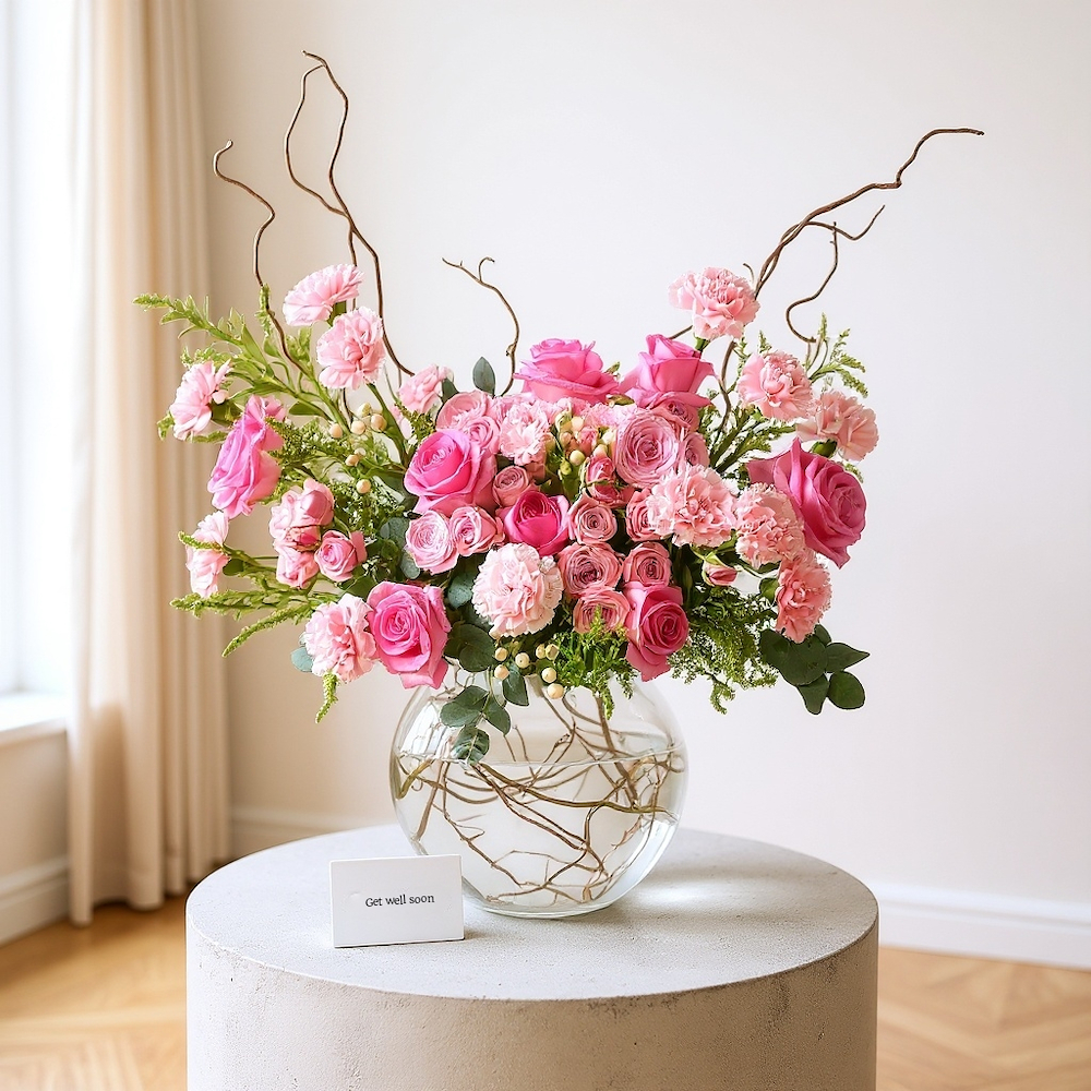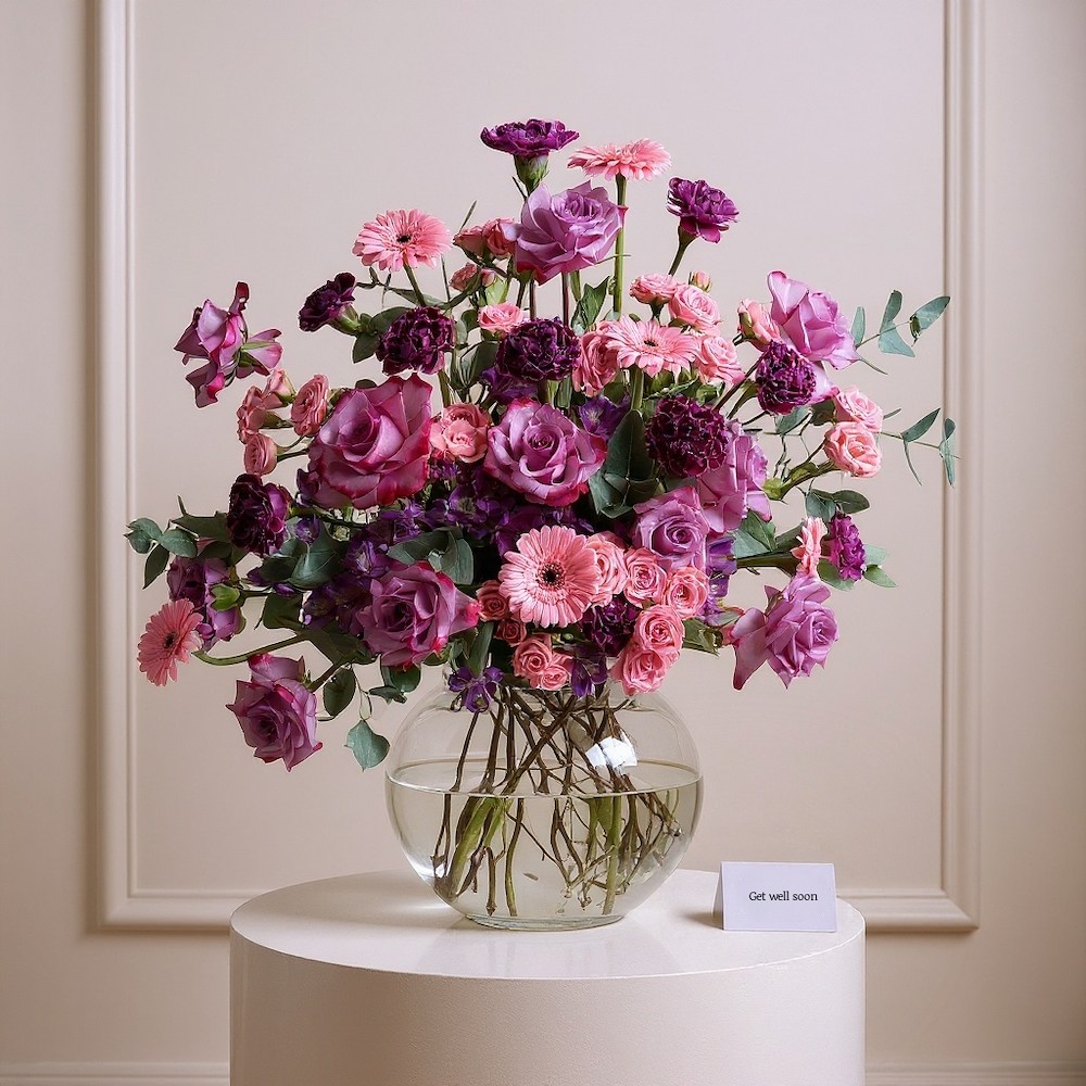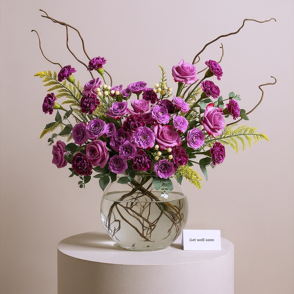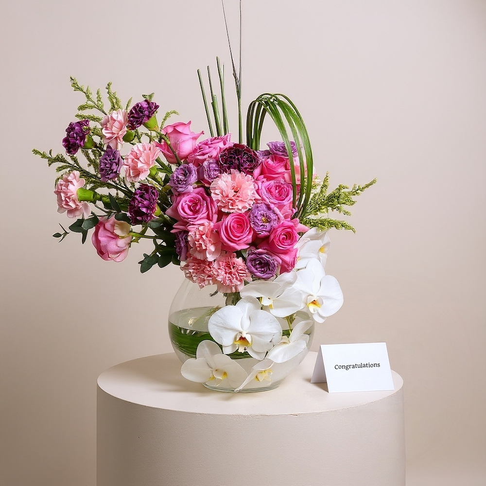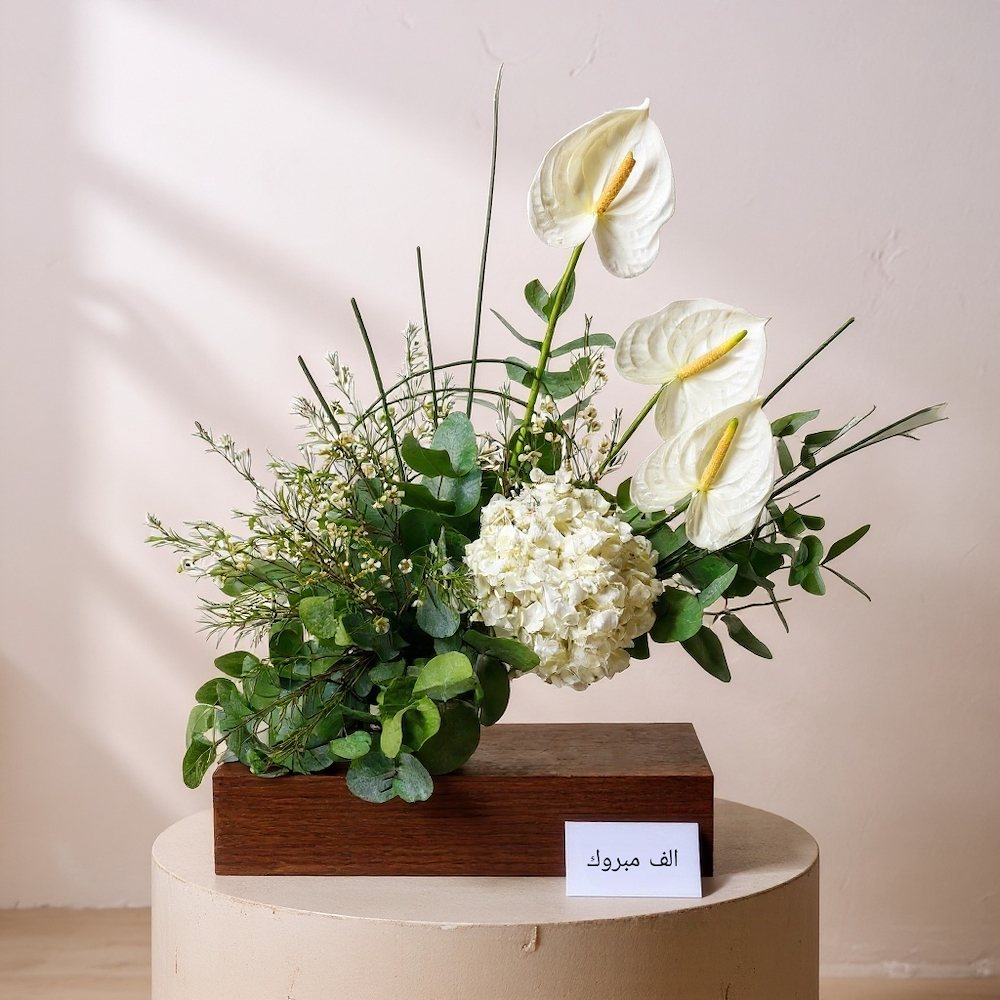 A luxurious blue box filled with baby roses and carnations with a baby suit and balloons.