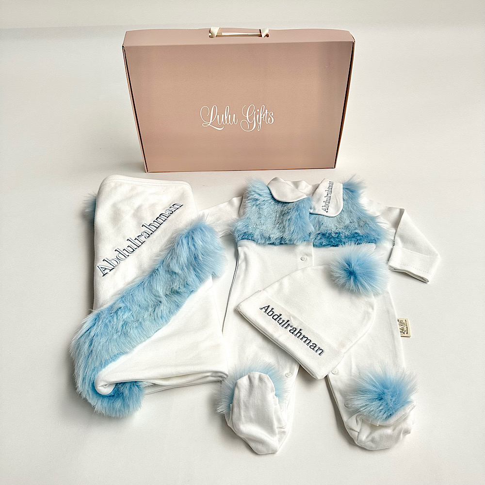 This baby set contains a cap, a baby suit, and a soft blanket. The fabric is cotton and fur, and it's suitable for 1-3-month-old and 3-6-month-old babies.