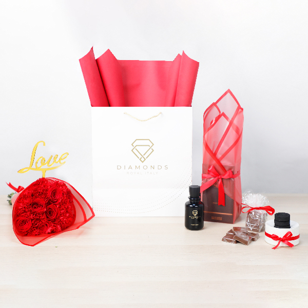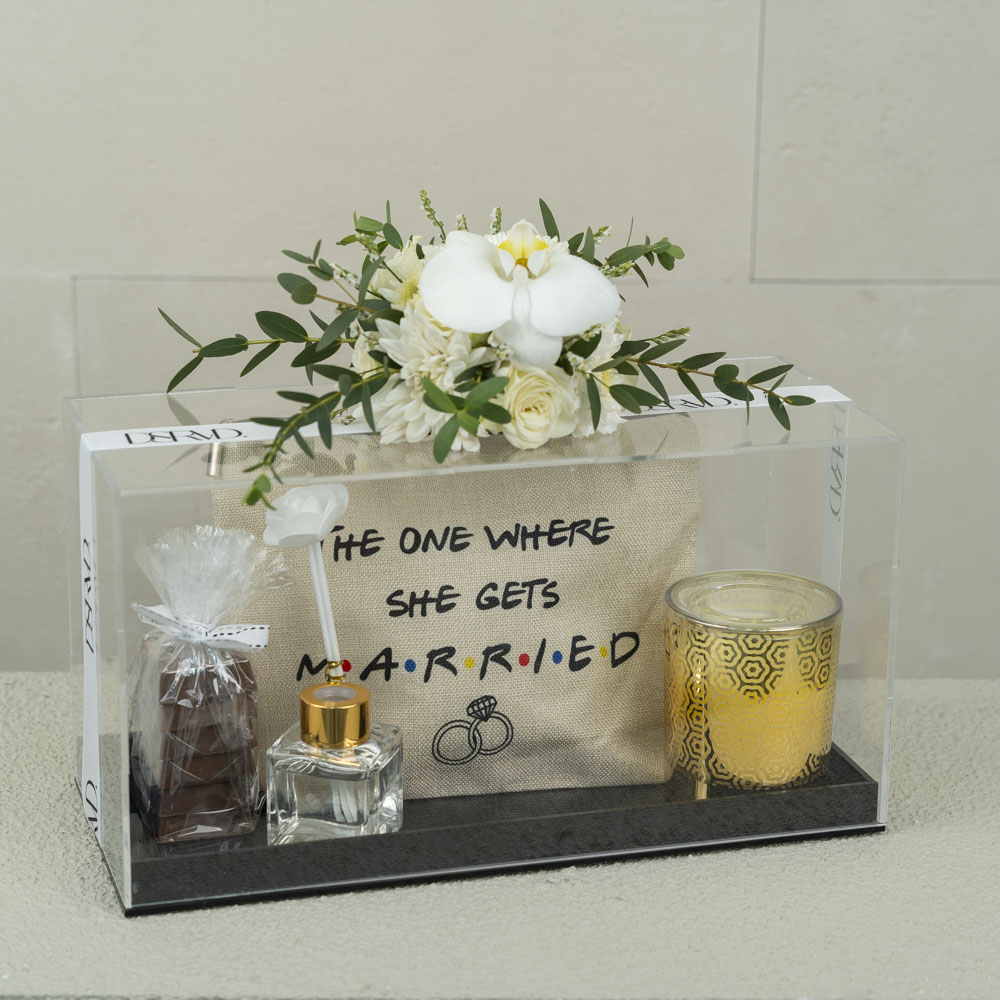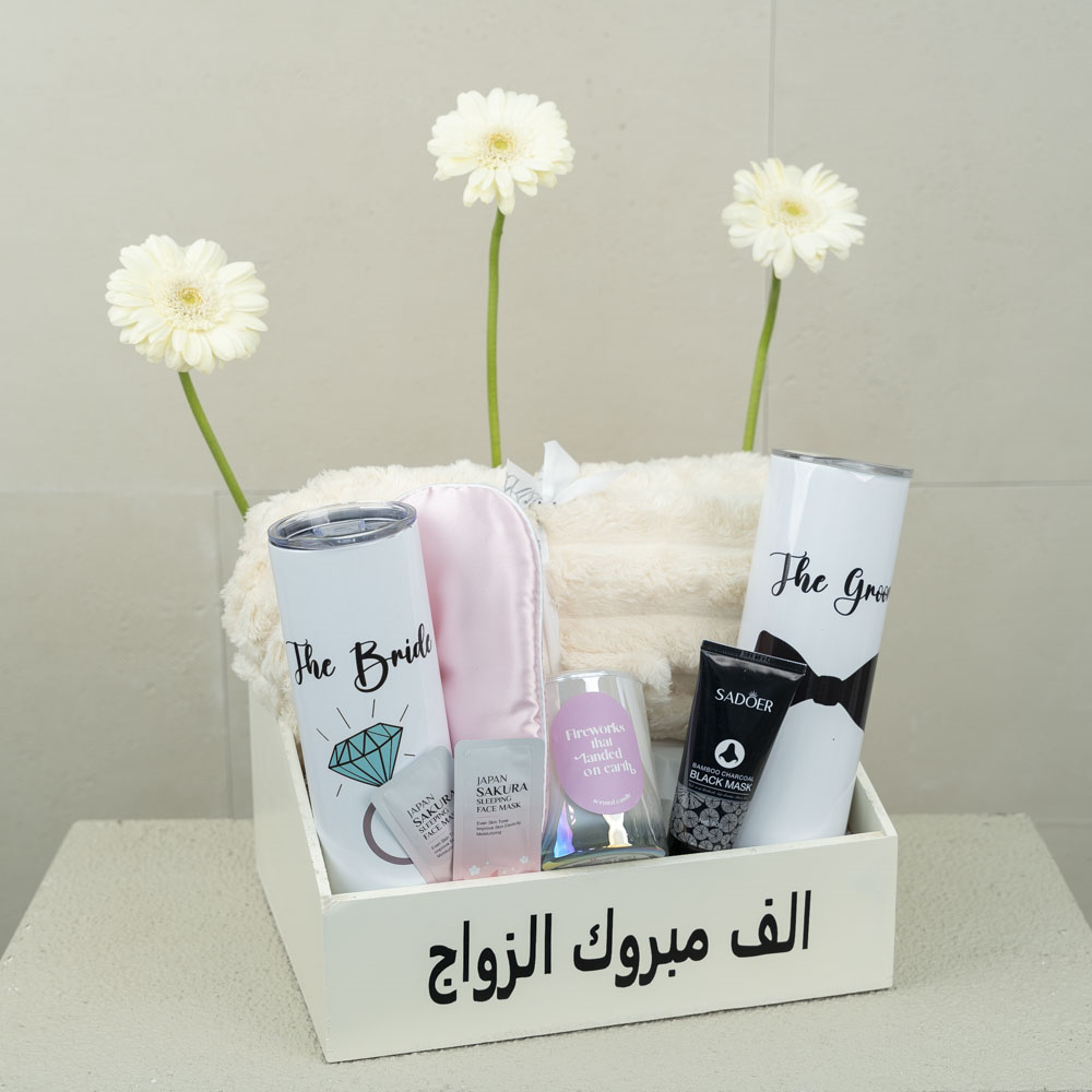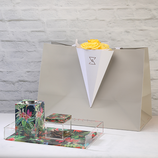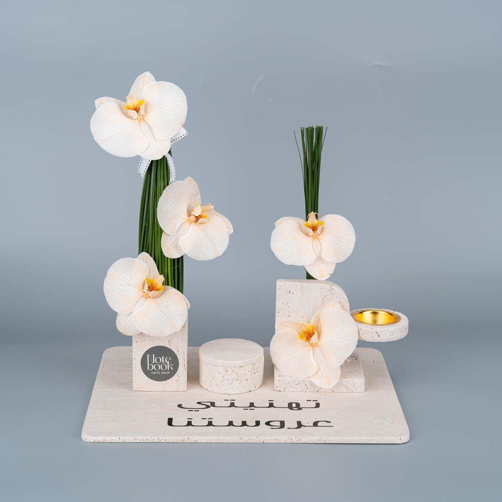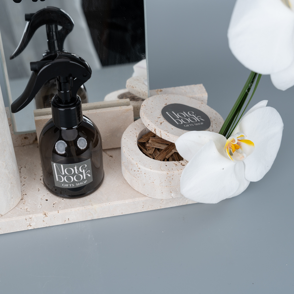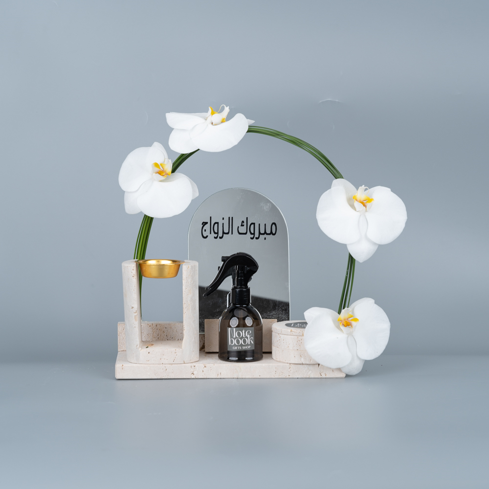 A stone tray styled with flowers contains a room spray, mubkhar and bukhour.