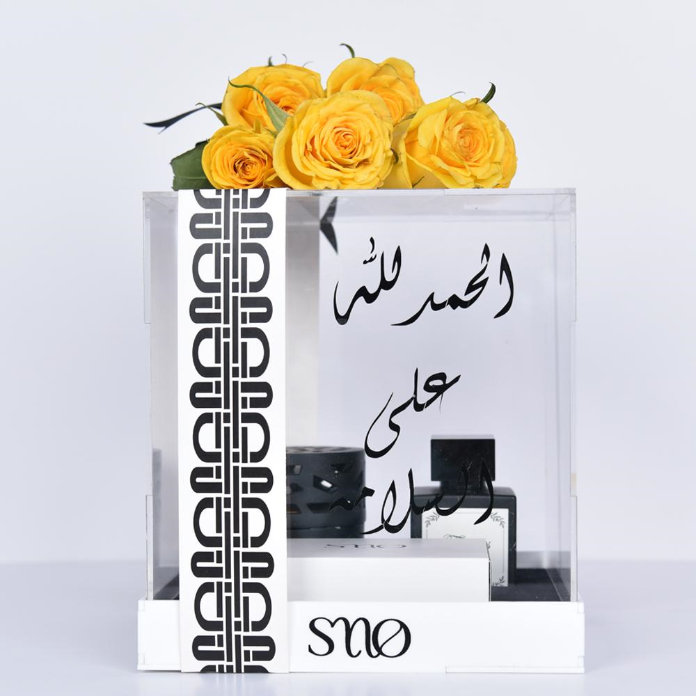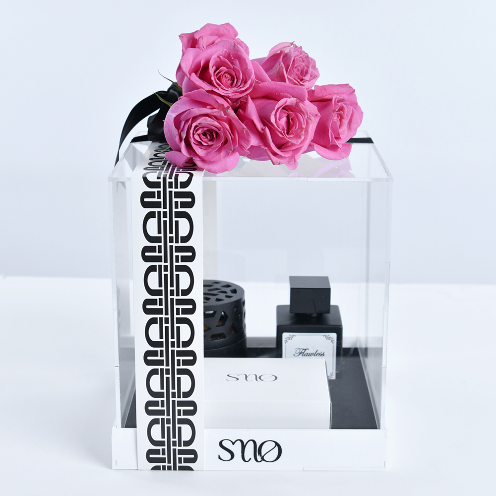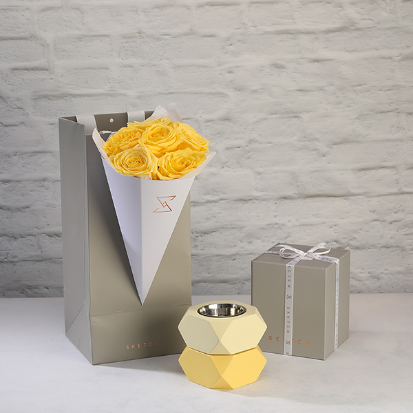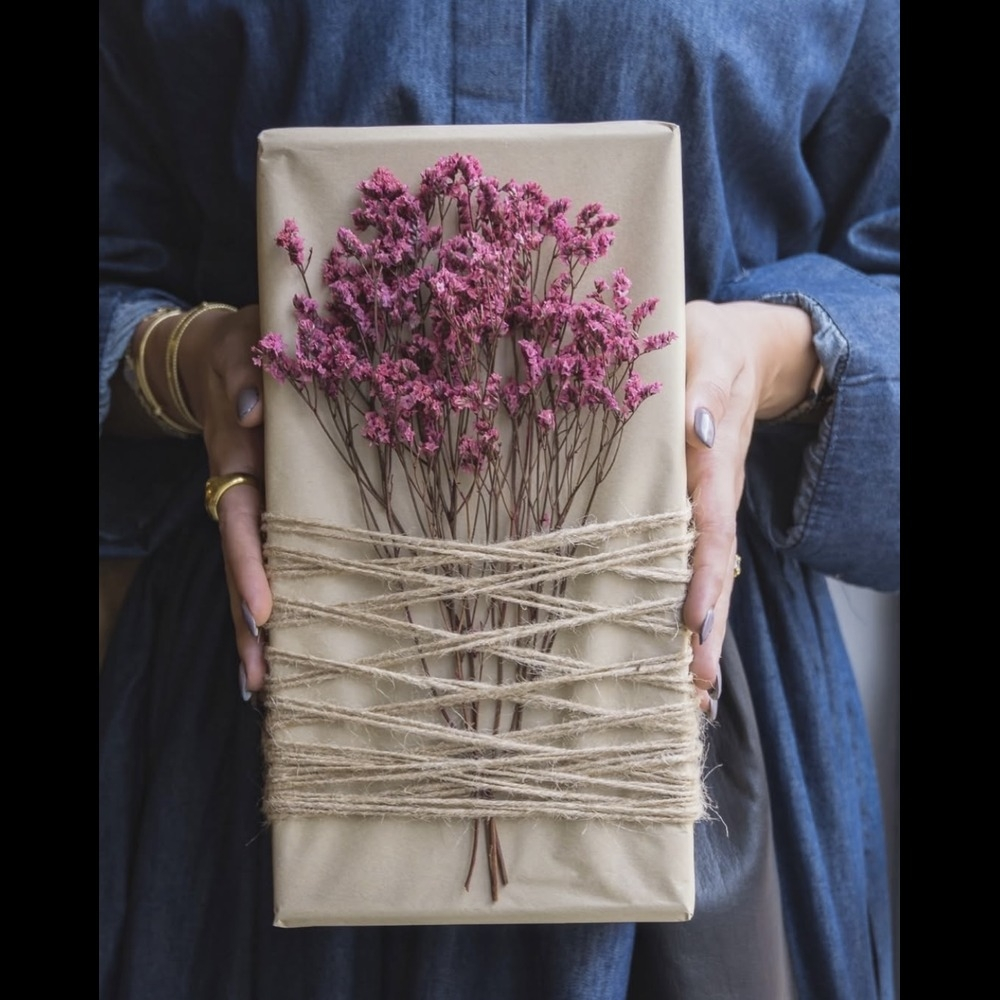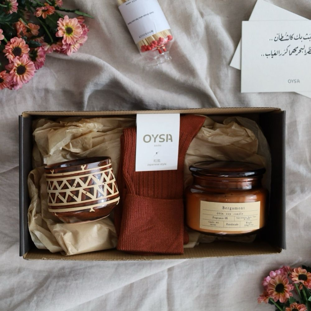 A gift box filled with a handmade ceramic mug, a Japanese-style sock, and ceylon tea with an strainer, comes to you in a box lovingly wrapped with dried flowers.