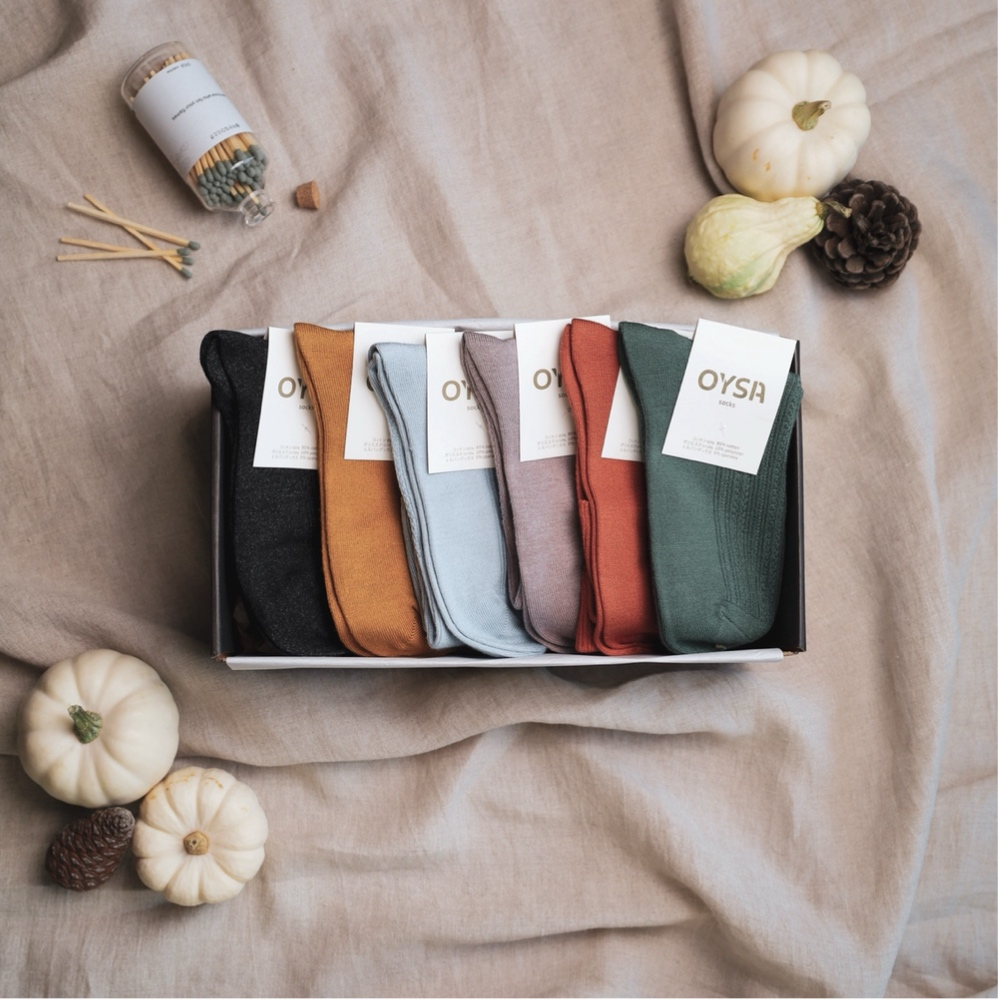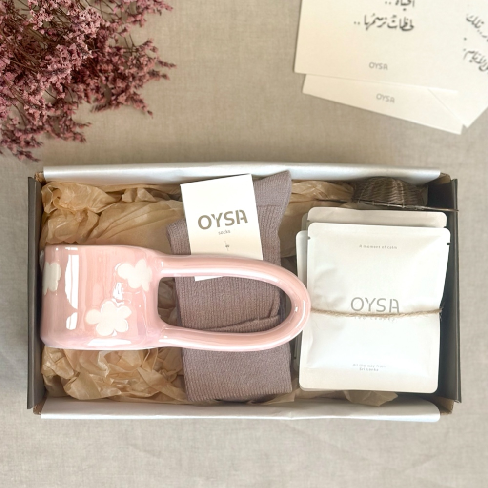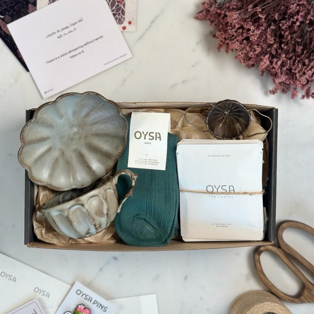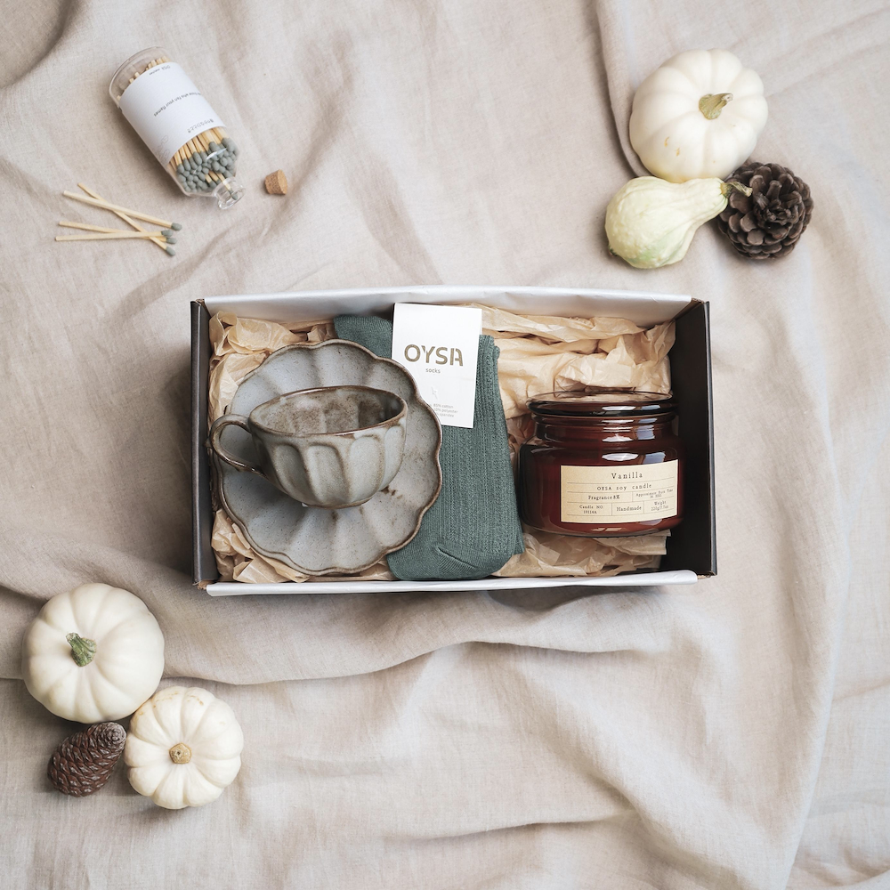 A thoughtfully curated gift box featuring a handmade ceramic mug, cozy Japanese-style socks, a soothing natural soy wax candle. Packaged with care in OYSA’s signature wrapping.