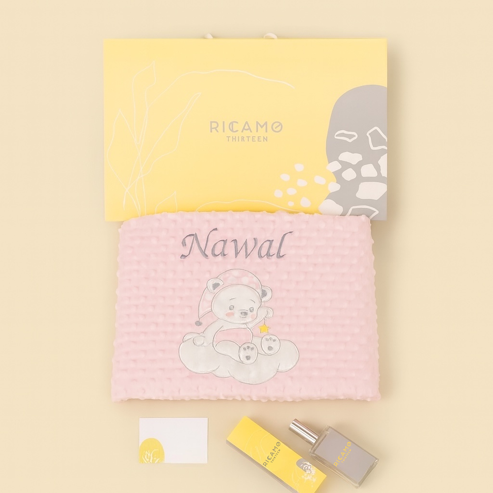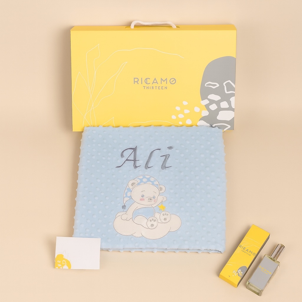 This gift set contains a new born baby bed with a pillow, a blanket, a small teddy bear, and a backpack for the child's necessities, containing many divisions to suit his needs with name in Arabic or English and special gift wrapping.