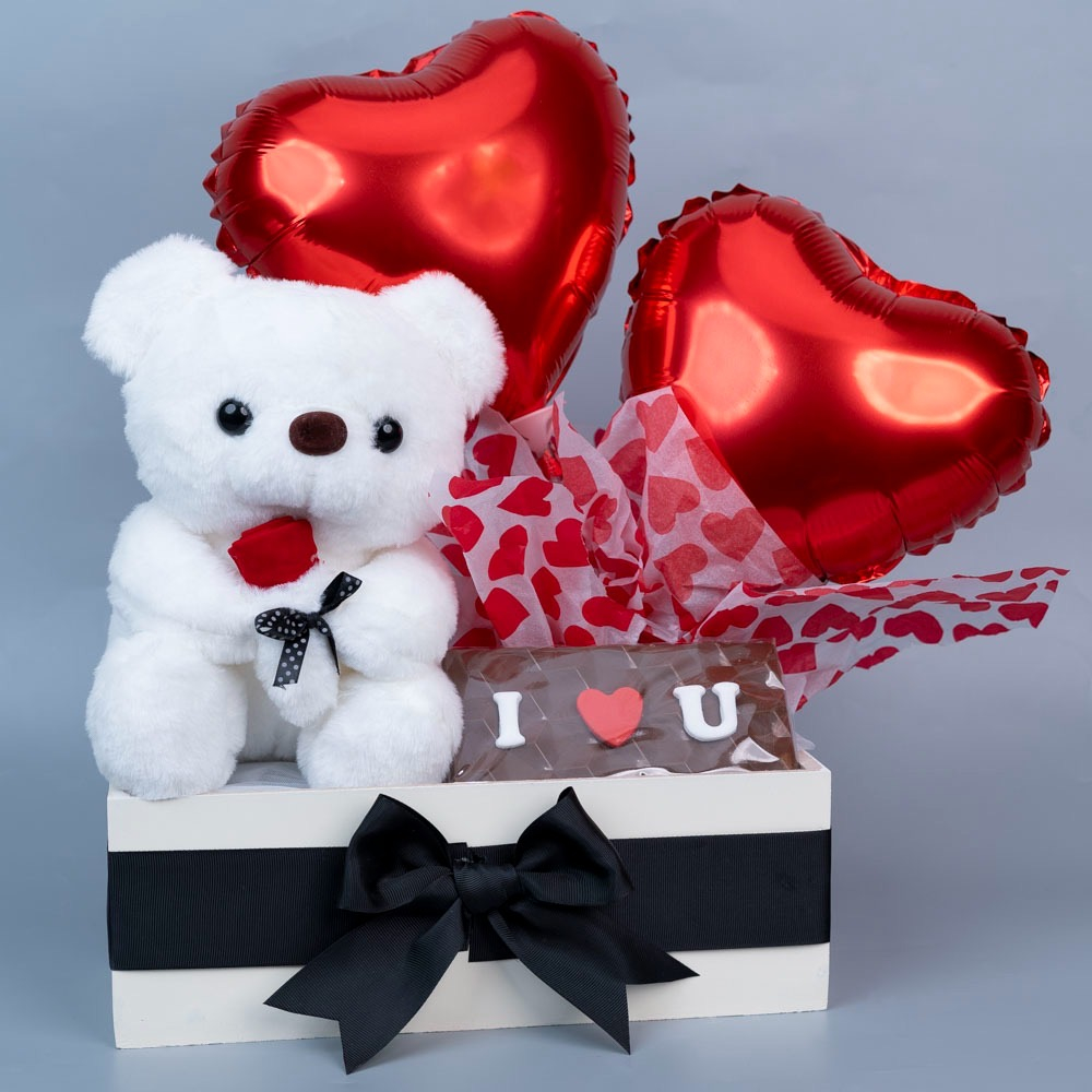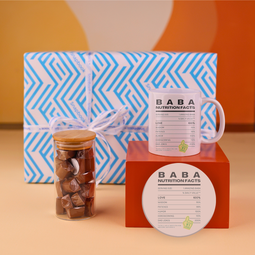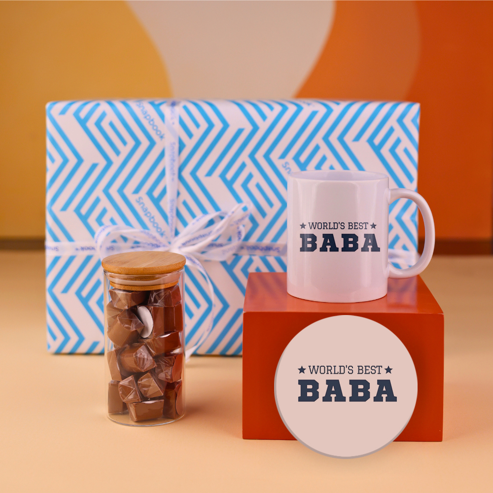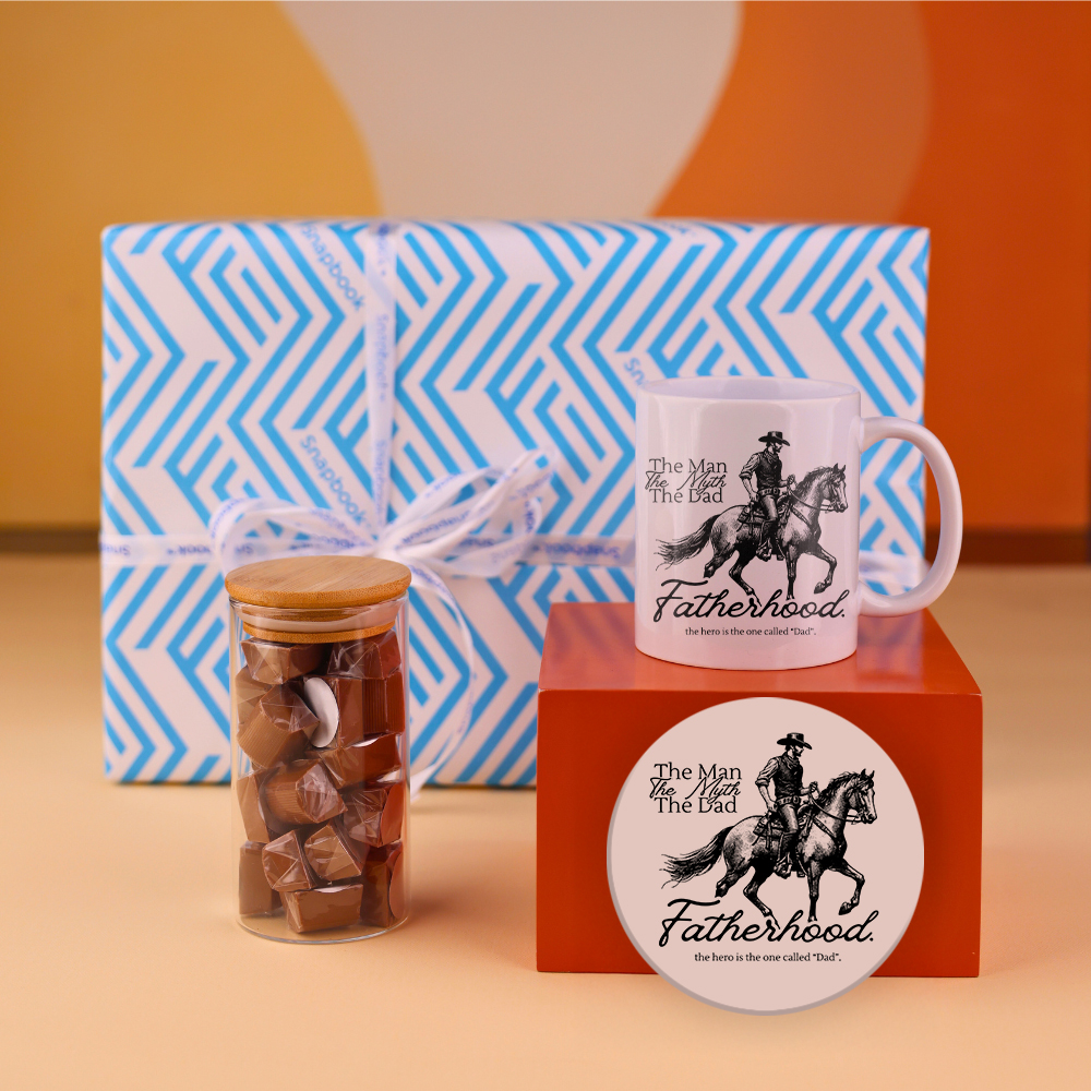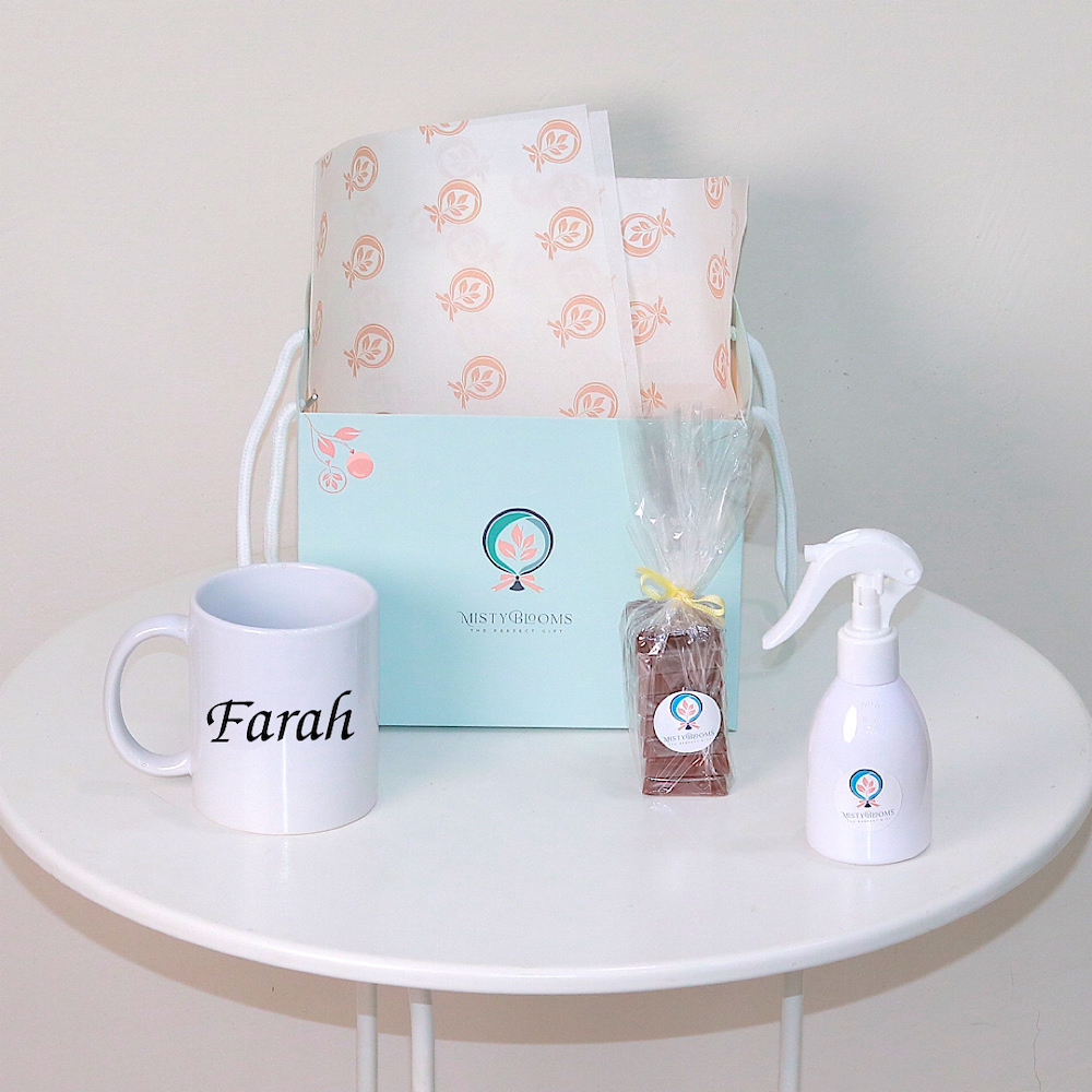 A gift set featuring a 350ml printed mug, matching coaster, and a jar of delicious chocolates.