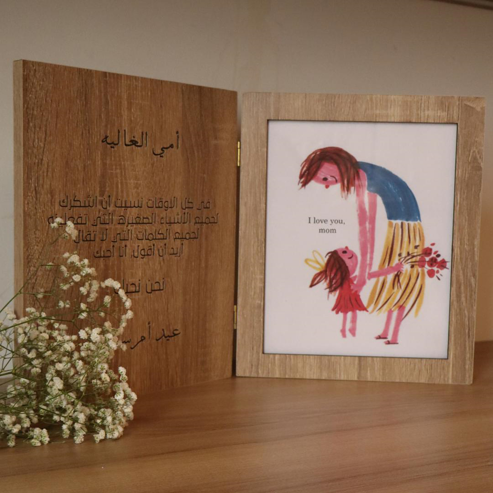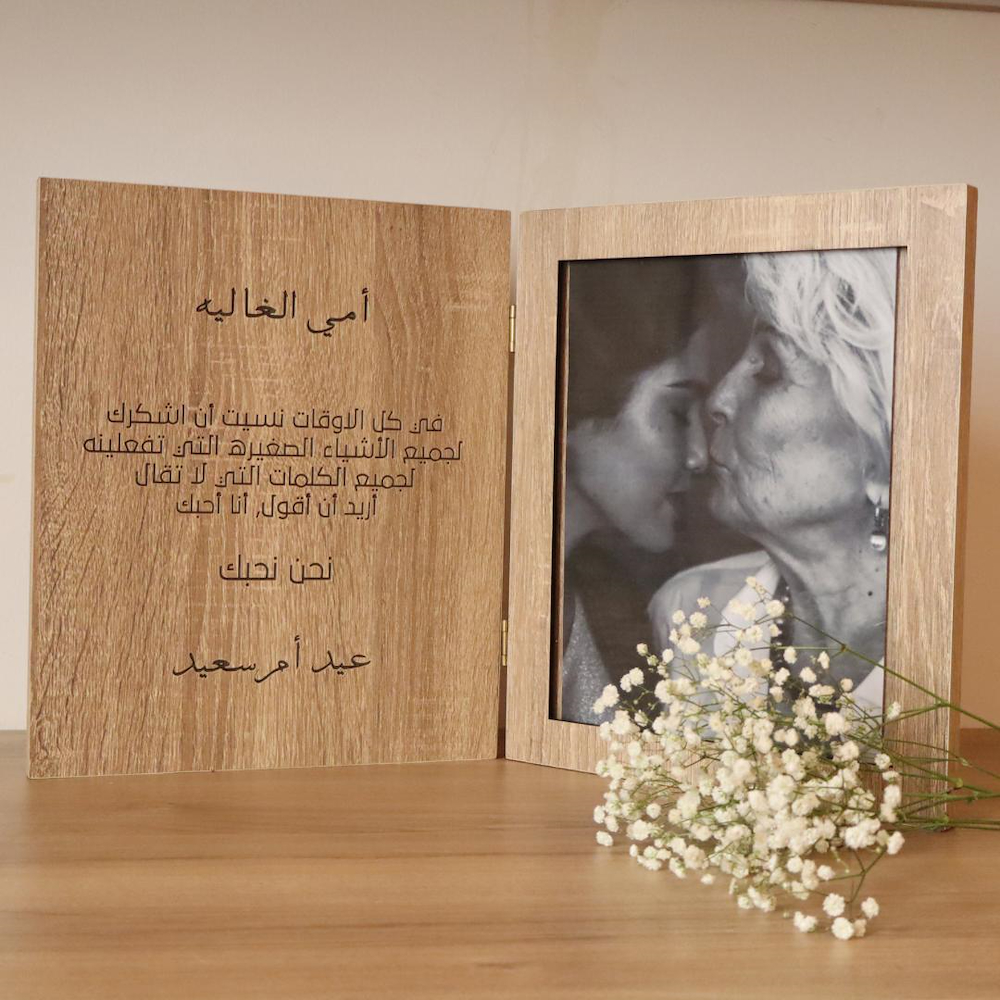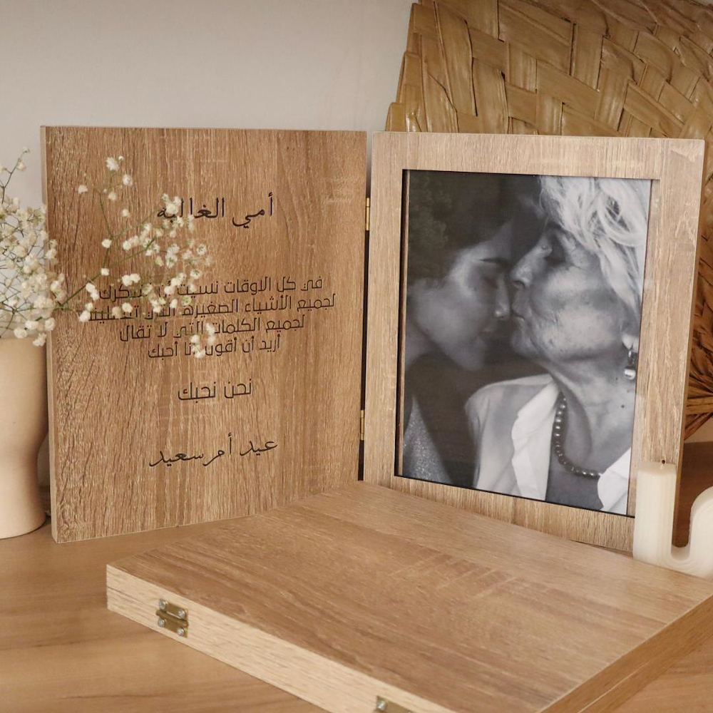 Show your appreciation to your mothers with our book style wooden photo frame lovingly engraved with a timeless script wrapped with tulle and finished with gypsophelia flowers, a heartfelt gift sure to be treasured for years to come.