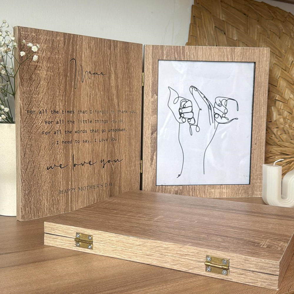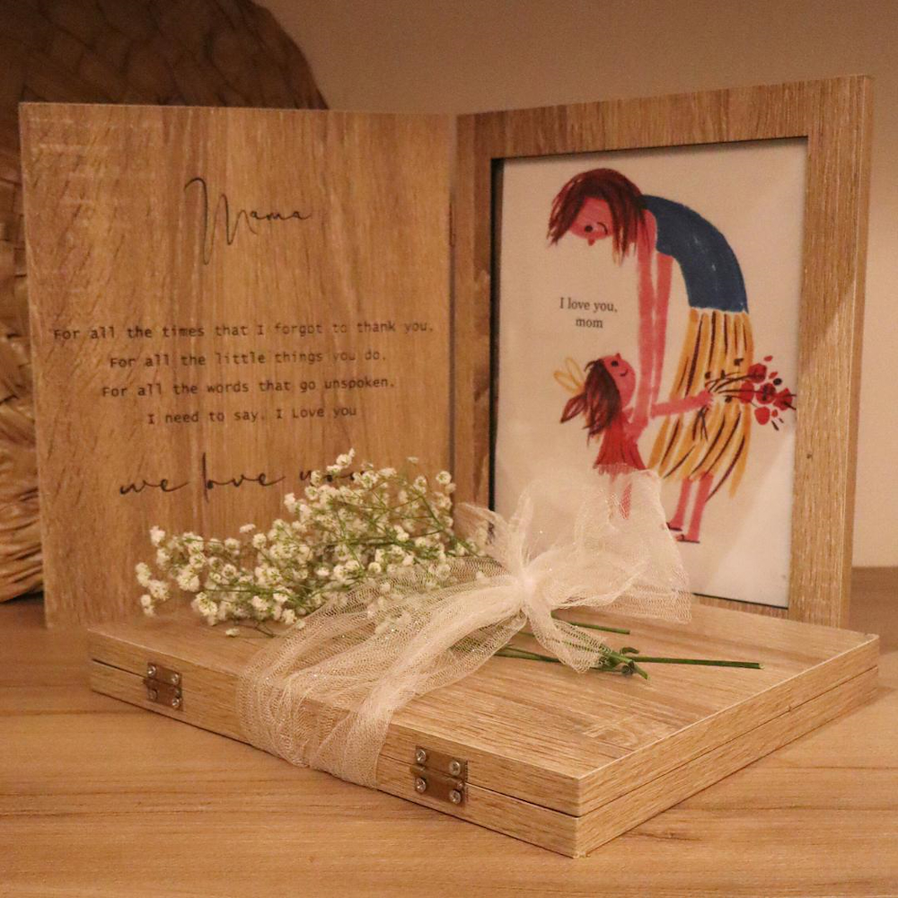 Show your appreciation to your mothers with our book style wooden photo frame lovingly engraved with a timeless script wrapped with tulle and finished with gypsophelia flowers, a heartfelt gift sure to be treasured for years to come.