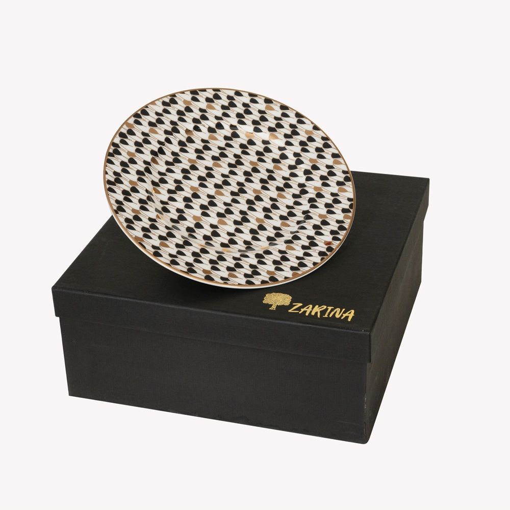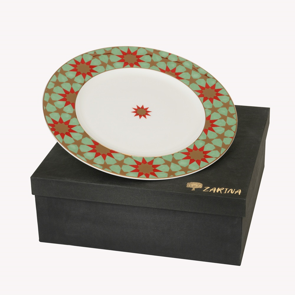 A set of 6 plates in green, red yellow and white used for dinner.