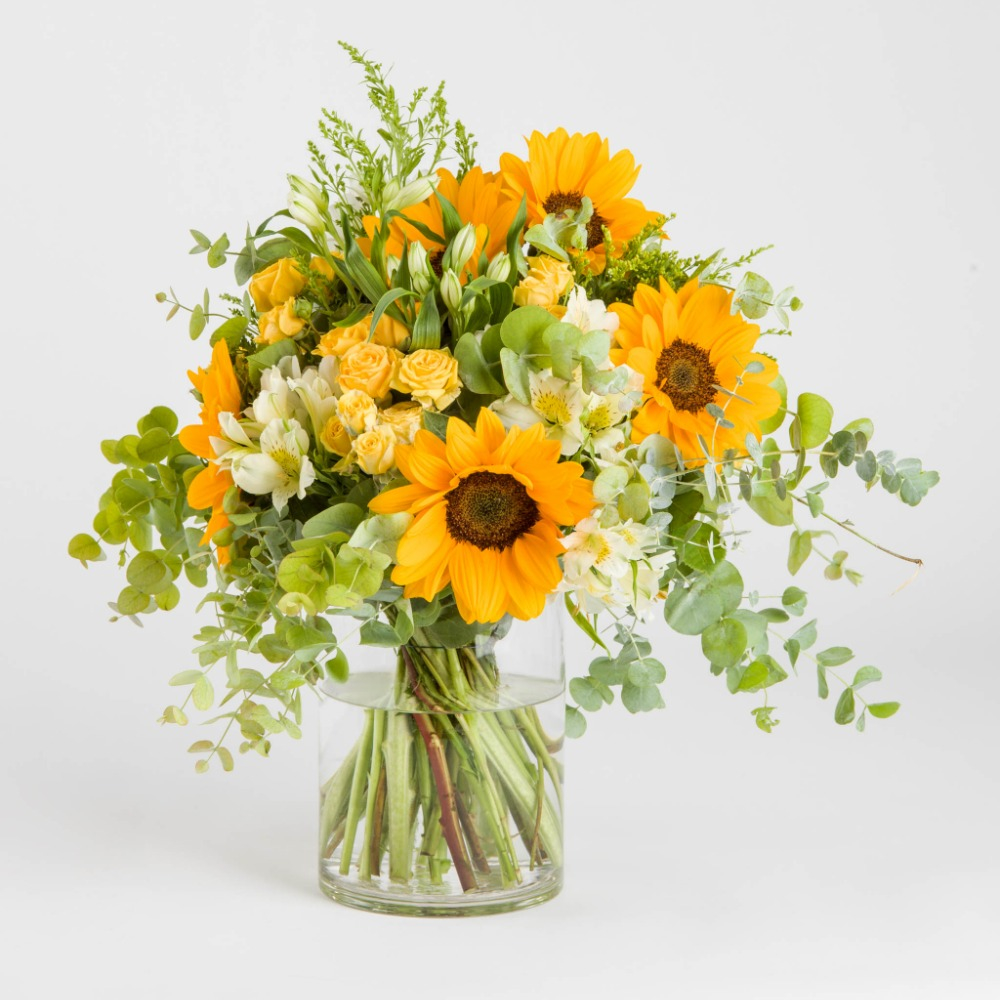 A little bit of sunshine in your abode is a timeless treasure of nature’s blooms. The eye-catching sunflowers are adorned with the dreamy touches of yellow spray roses and the pristine presence of white alstroemerias, complementing the whimsical Solidago magic, while the unmistakable fragrance of the verdant eucalyptus brings a fresh of breath air. Our positivity-radiating ‘Blooming Trésor’ floral arrangement is a canvas of hues and fragrances thriving within the embrace of an elegant.
