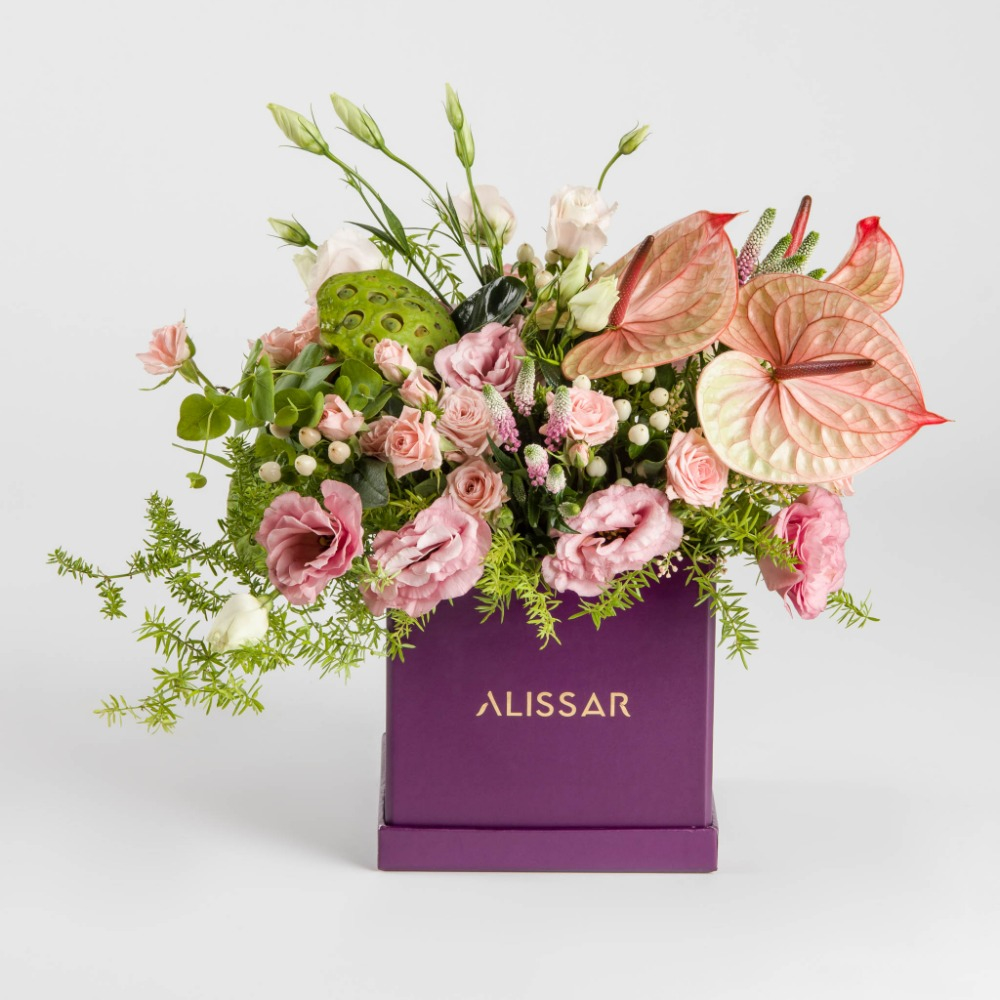 Opulence flowers this summer with ‘Opulently Yours,’ a treasure of an arrangement rich in a mesmerizing array of flowering beauties in an impressive spectrum of pink hues, accented with ever-so-delicate touches of white and green. The aptly named ‘Opulently Yours’ open box of flowers is brimming with eye-catching Anthurium Tequila, ethereal spray roses, graceful Lisianthus, radiant hypericum, charming Veronica, majestic Nelumbo, and lively asparagus leaves.