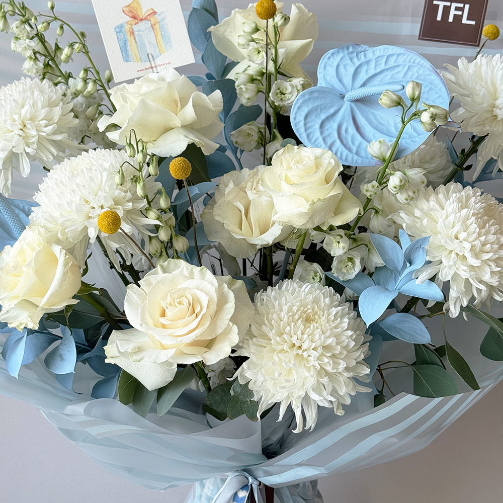 A hand bouquet containing roses, hydrangeas, chrysanthemums, and anthuriums, arranged beautifully in blue wrapping with our special gift card.