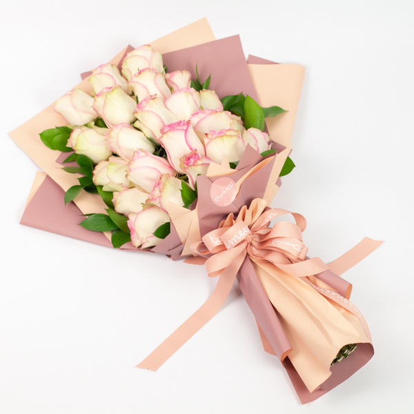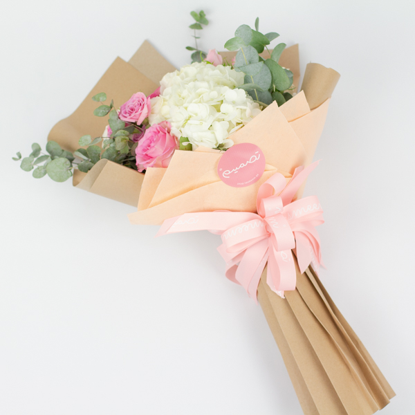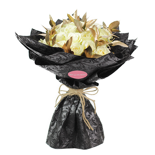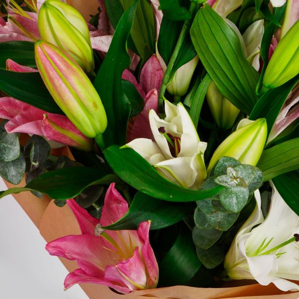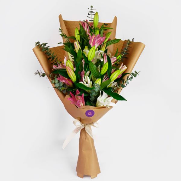 A 14 pcs lily with eucalyptus leaves in a brown paper wrapping.