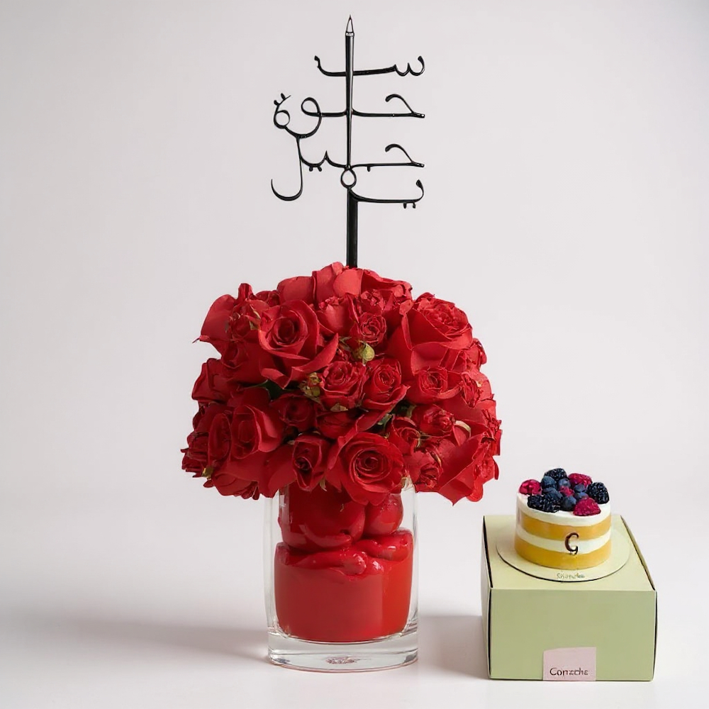 A vase that contains roses along with a cake from Ganache.