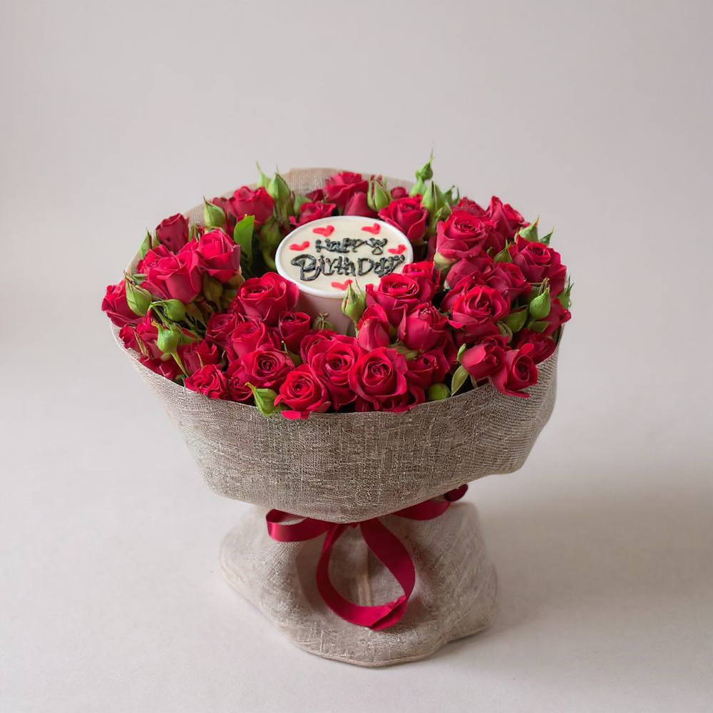 A bouquet filled with red roses Munch cake.