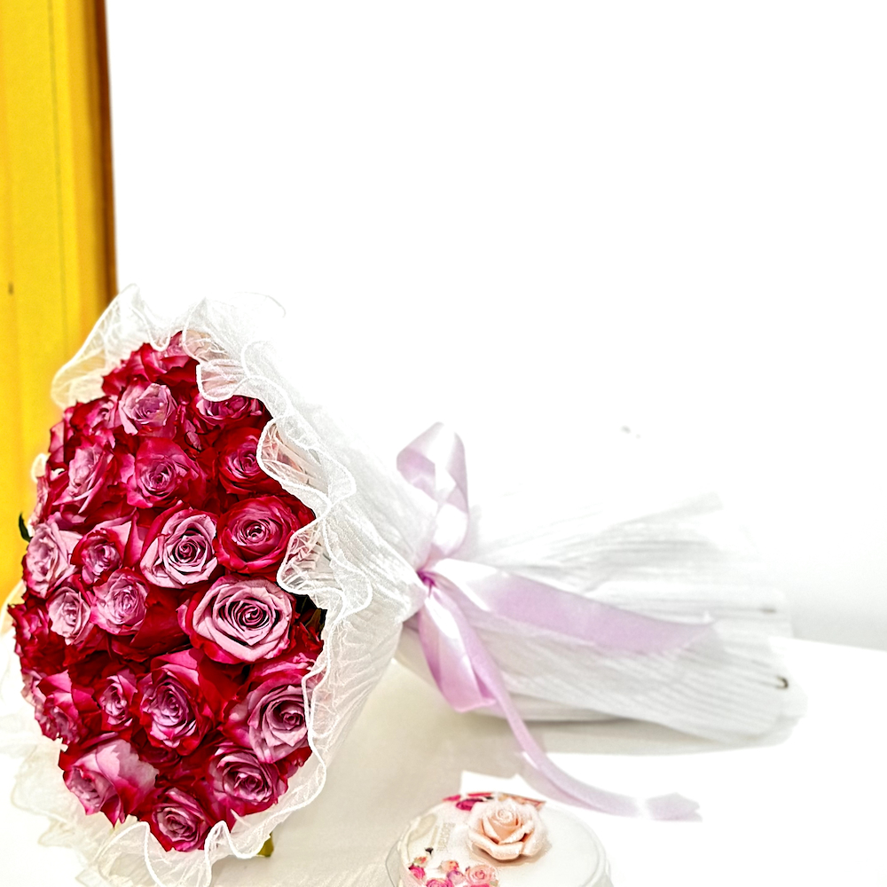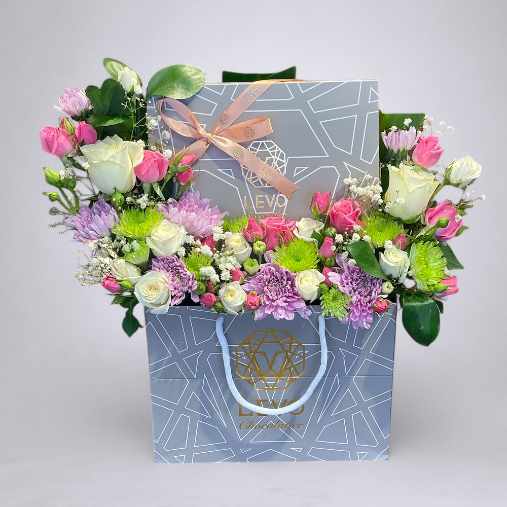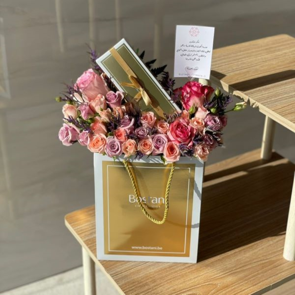 A bouquet containing roses and eucalyptus with Belgian chocolate from Boustany.
