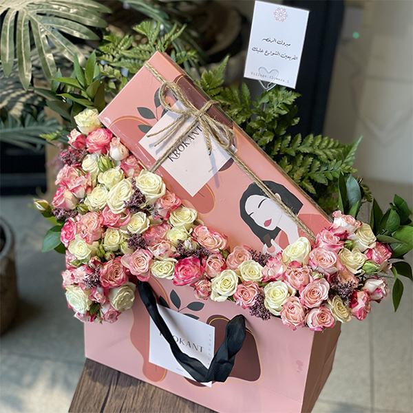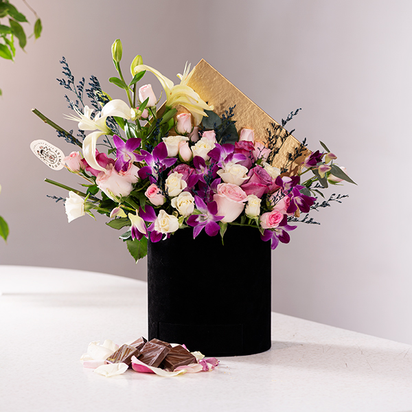 This bouquet contains roses, and tulips with a chocolate box from Livo.