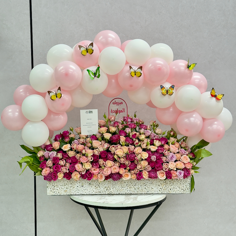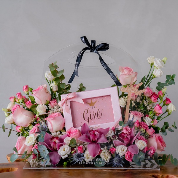 An arranged tray of luxurious flowers and green accessories, with a chocolate gift from Bostani.