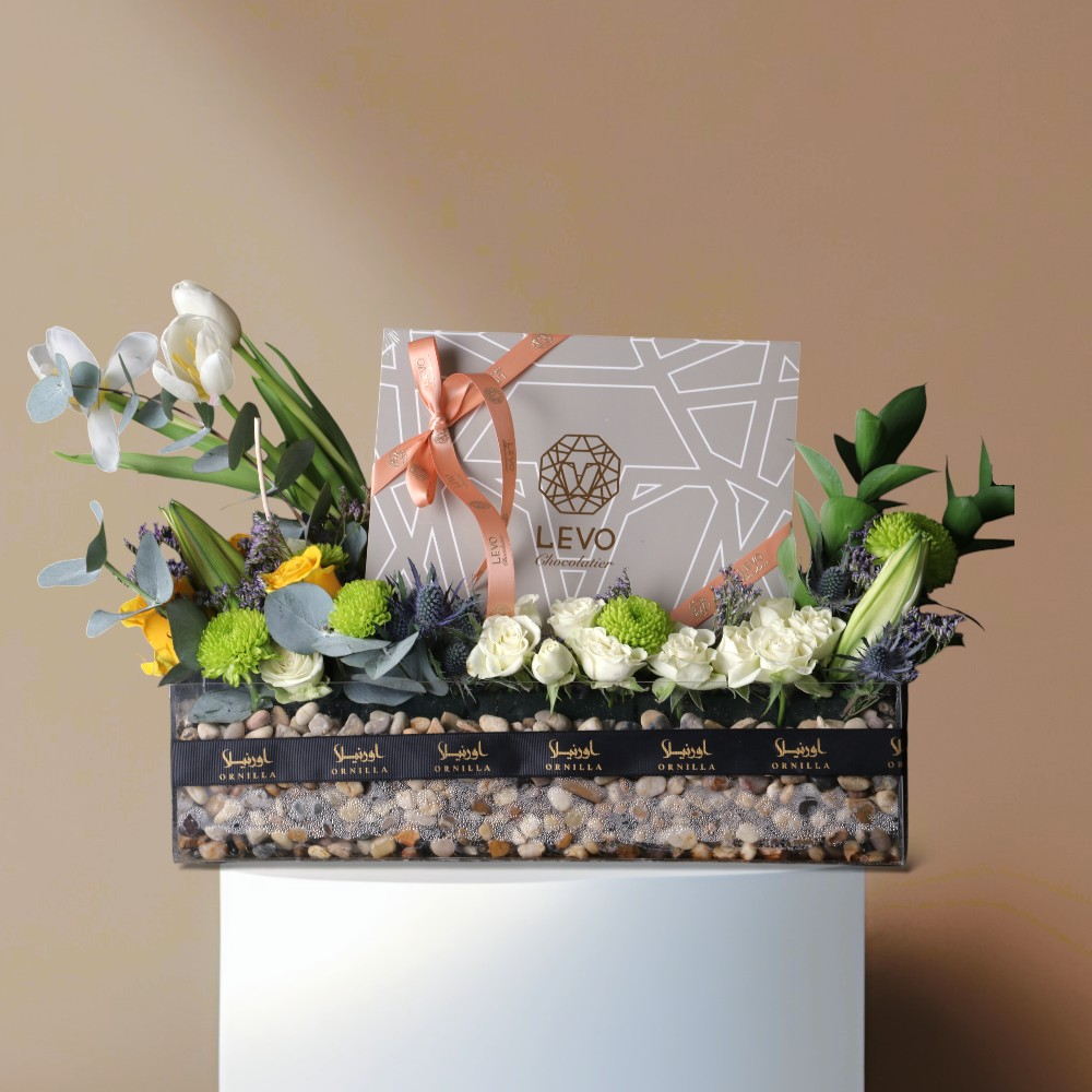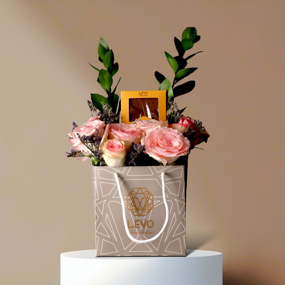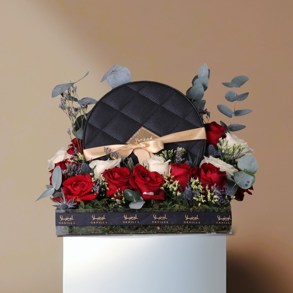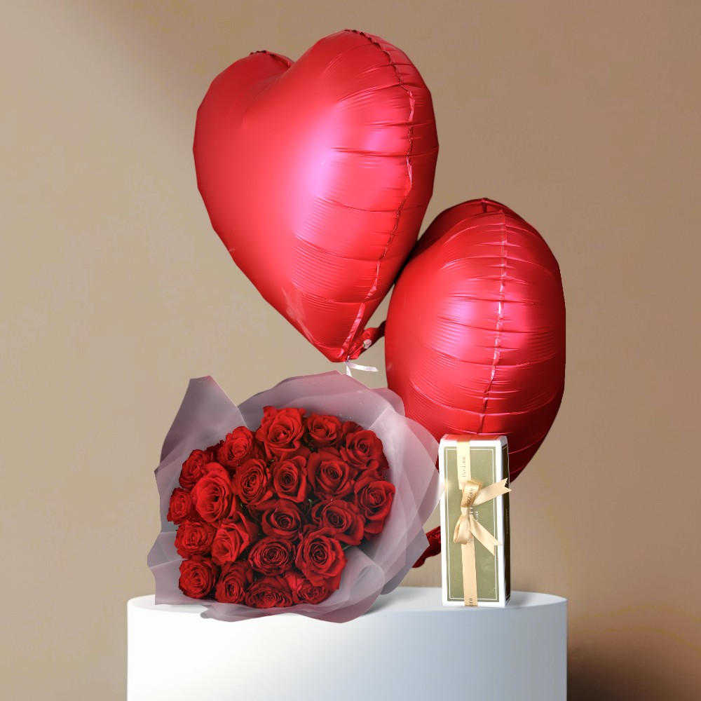 A bouquet containing roses, balloons, and Belgian chocolate from Boustany.