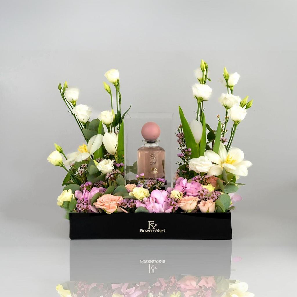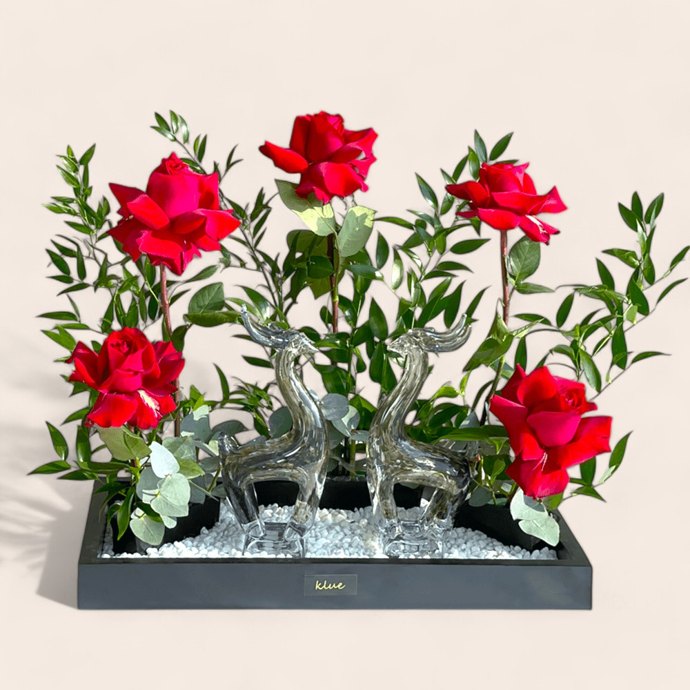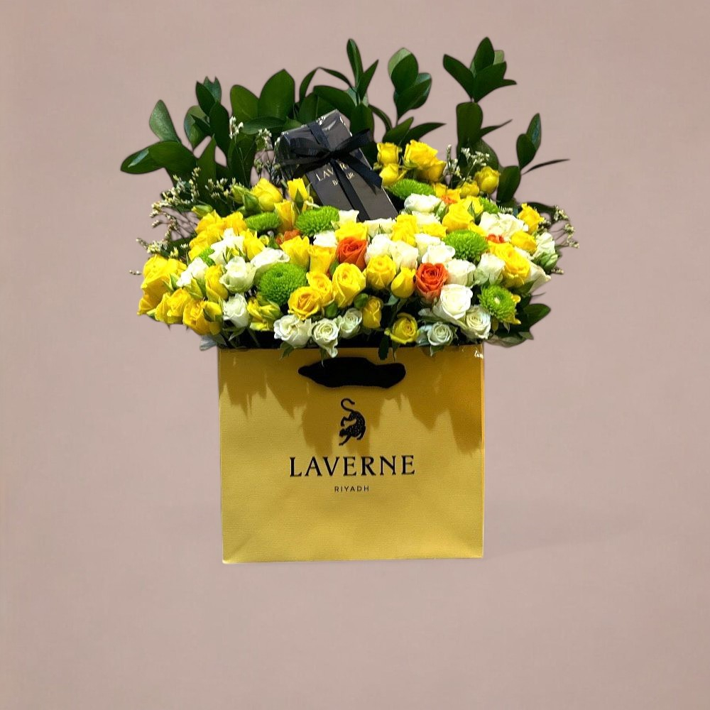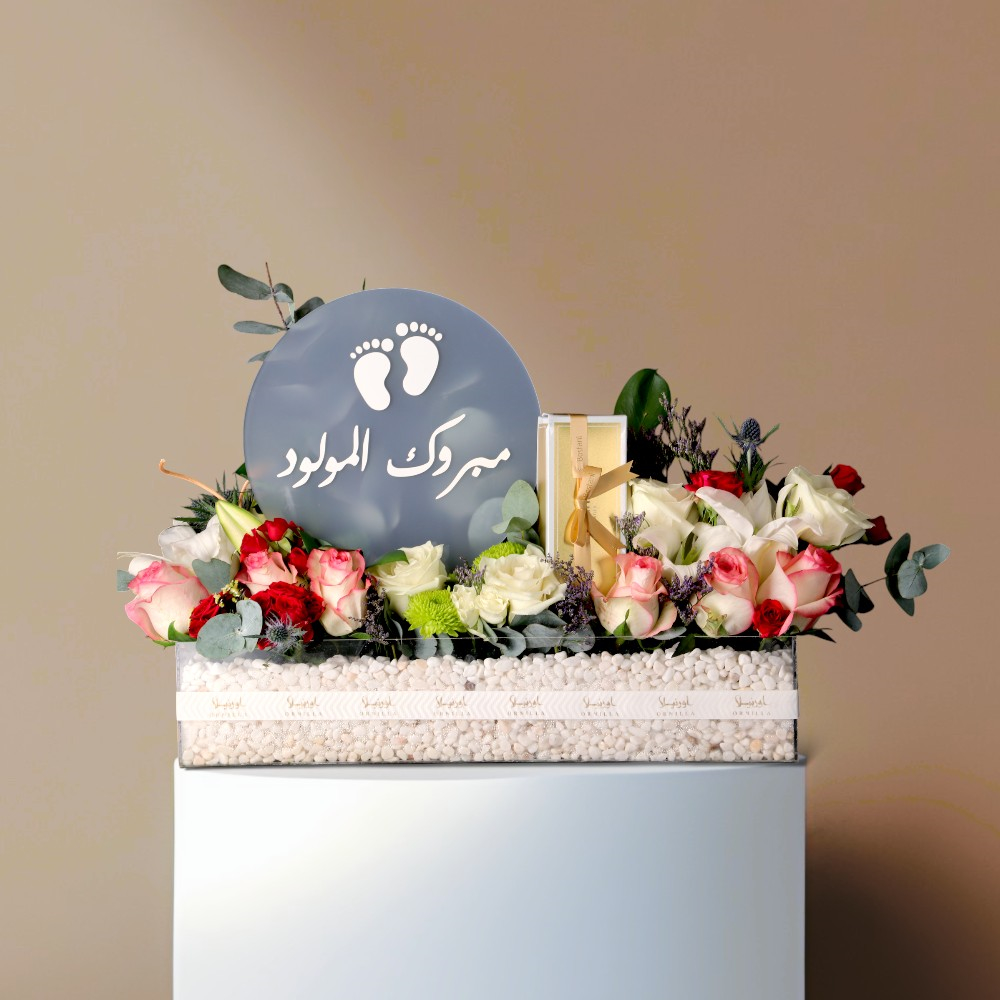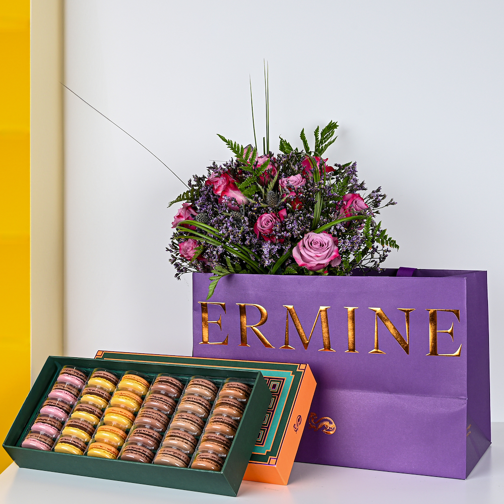 A bouquet containing roses, balloons, and Belgian chocolate from Boustany.