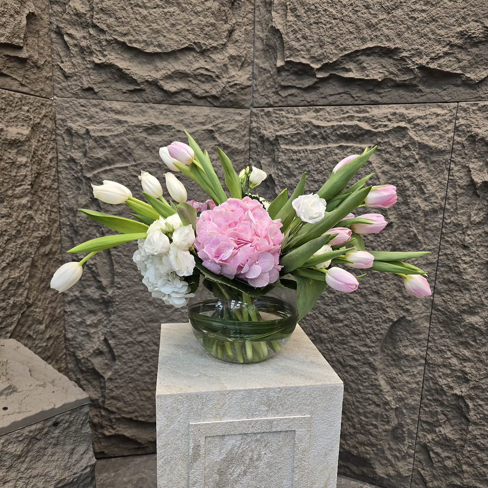 Tulin bouquet of red roses, red baby roses, and white alstroemeria in a unique arrangement.