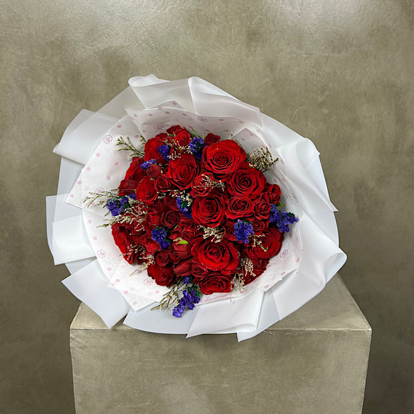 A bouquet filled with red roses and Patchi chocolate bar.