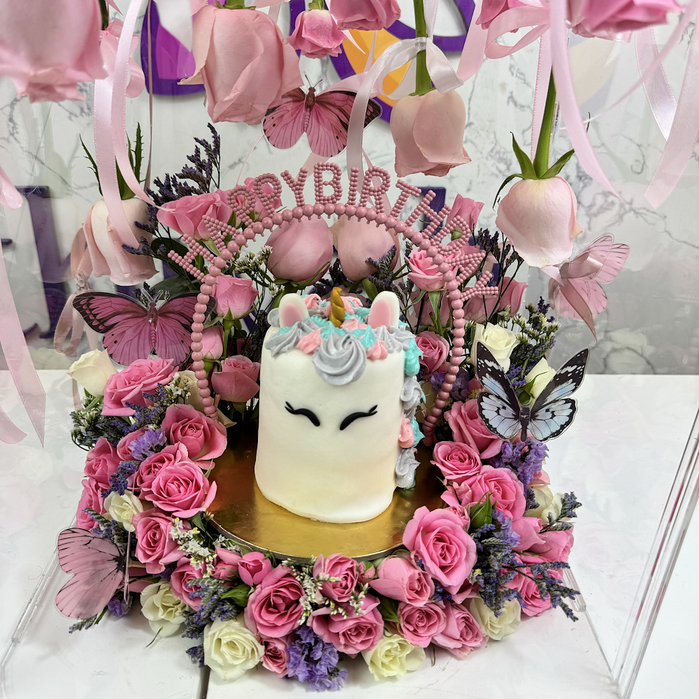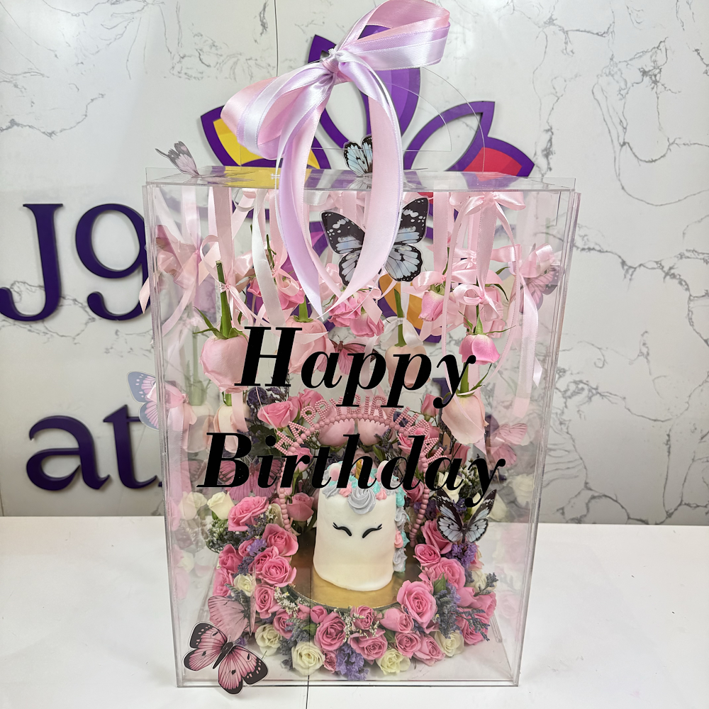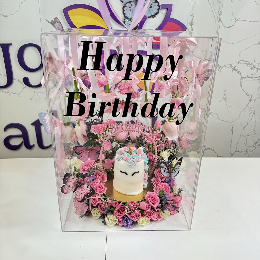 Add a touch of luxury and fun to your birthday with the magic box of joy. This clear acrylic box with a flip-up door contains a beautiful arrangement of a celebratory cake surrounded by roses and baby roses in all shades of pink. The beautiful butterflies add a touch of magic to this wonderful surprise, making it the perfect gift to celebrate a memorable birthday.