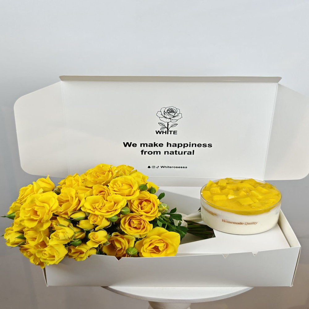 An elegant box that combines luxurious taste and natural beauty contains the delicious mango ganache cake with ten branches of yellow baby rose with an attractive design inside a luxurious box of white roses perfect for gifts and special occasions.